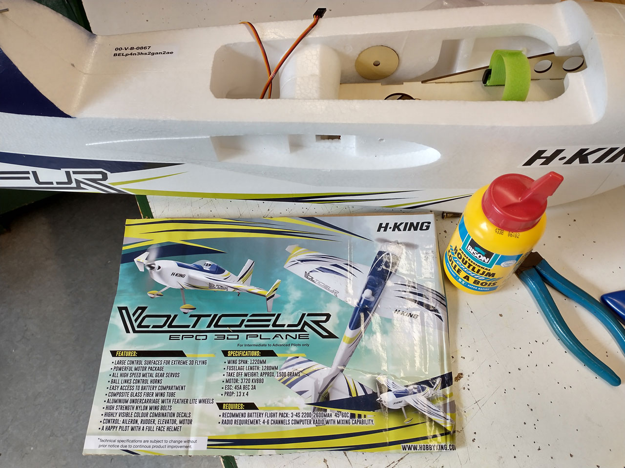 Ik heb in de vleugels en stabilo aan weerszijden bij romp en uiteinde ca. 10 cm scharniertape ingeplakt; de roeren zitten immers niet vast met scharniertje, daar was alleen de epo geplet.