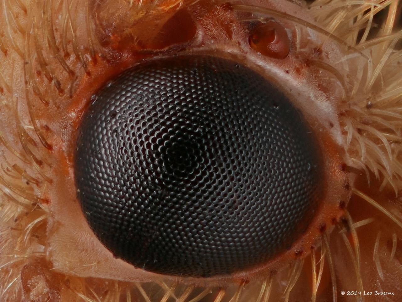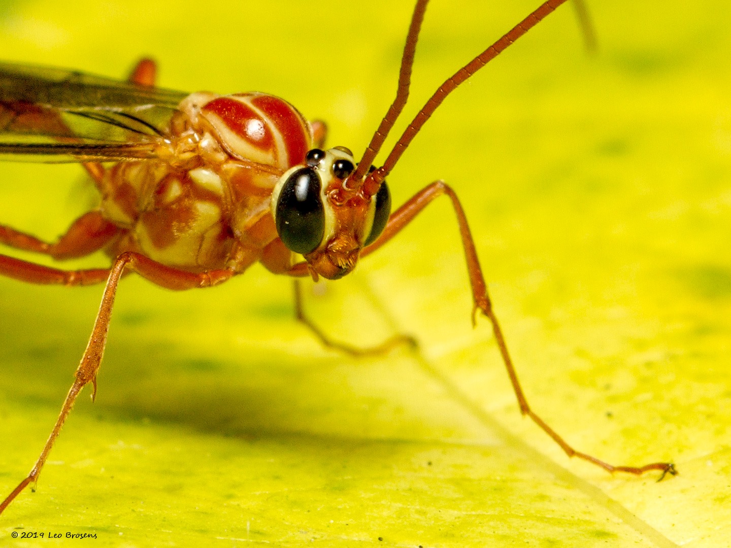 Nog een portretje van de sluipwesp, nu de kop groter in beeld gebracht om een typisch kenmerk op de kop te benadrukken. Tussen de twee grote ogen zie je achter de antennes een drietal ronde bolletjes staan. Dat zijn ocelli ofwel enkelvoudige ogen. Je kijkt een beetje in de voorste twee waardoor ze zwart over komen, bij de derde, rechts achter, kijk je meer door de lens waardoor dat oog minder zwart toont. De wetenschap is er nog niet helemaal over uit welke functies en prestaties deze drie extra oogjes hebben. De insecten nemen de omgeving vooral waar met hun twee grote uit facetten samengestelde ogen. Niet alle insecten hebben de drie extra kijkertjes maar het overgrote deel wel.
