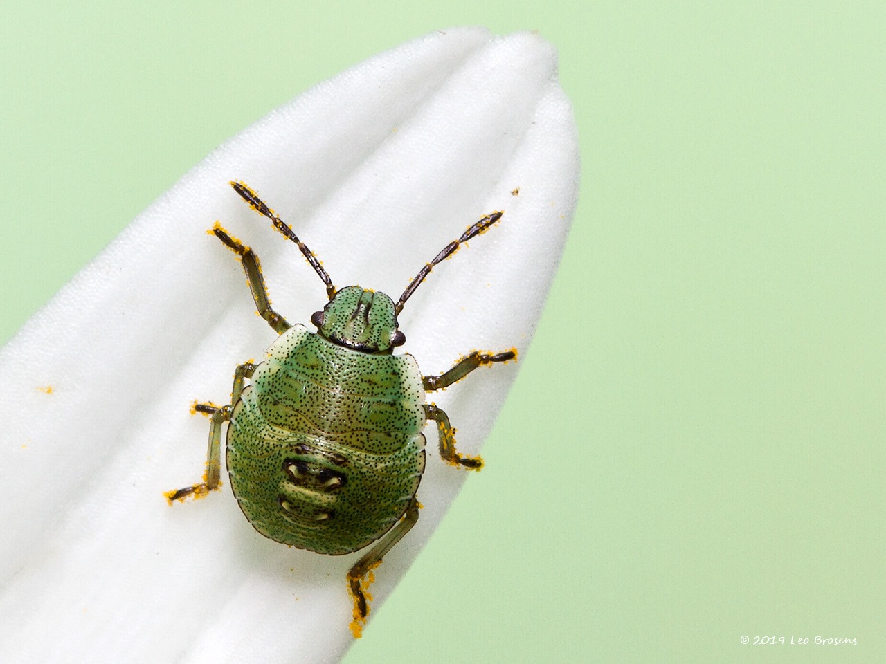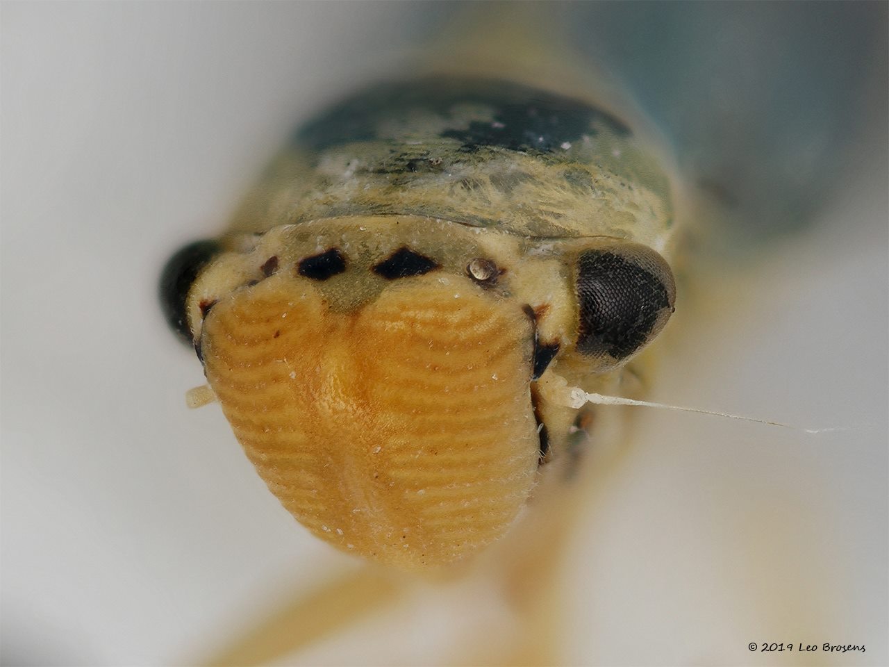 Een poos terug vond ik binnen op de vensterbank een vuiltje. Dat vuiltje bleek een dood beestje. Het bleek een klein cicade'tje van slechts 6 mm groot te zijn. Wellicht een groene cicade uit de hele grote familie van Cicadellidae. Ik heb mijn macrolens nog eens opgezocht en een vooraanzichtje gemaakt, 3 op 1 met de Canon MP-E 65 lens. Heb meerdere foto's gemaakt en de meest scherpe delen bij elkaar gevoegd met een speciale app. Het diertje mist een van de kleine antennes op de kop. Die kop is stomp en je ziet geen mond. Dat komt omdat cicaden geen normale mond hebben maar wel een soort steekbuis die naar achteren wijst en hier niet te zien is en waarmee ze plantensappen aftappen. Dat kunnen ze heel goed en zo vormen ze nogal eens een plaag bij de groentekweker. Ze kunnen ook ziektes over brengen. Eén legsel van het vrouwtje kan uit honderden eitjes bestaan die binnen de zes tot acht weken uitkomen. Volwassen dwergcicaden springen of vliegen bij het minste gevaar weg. De jongen hebben nog geen vleugels en kruipen naar de onderkant of de schaduwkant van het blad. Hierdoor zijn de dwergcicaden vaak onopgemerkt op bomen of planten.