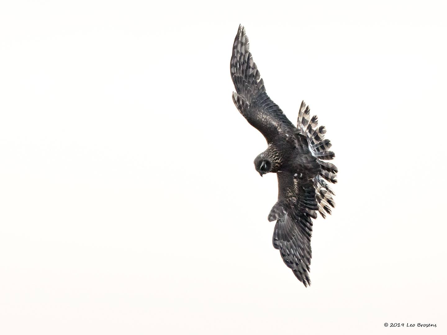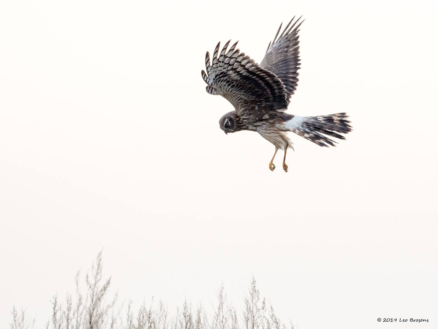 Een mooie flink grote roofvogel is deze kiekendief. Te herkennen aan de typische manier van vliegen, laag, trage vleugelslag, vleugels iets in v vorm. Hier is dit vrouwtje, het is een vrouwtje want dat is te zien aan de witte stuit, gefocused op iets beneden haar vandaar de uithangende poten. Het witte masker bij de ogen is ook een kenmerk. Enkele honderden noordelijke vogels overwinteren verspreid over het land. Ze gebruiken gezamenlijke slaapplaatsen in hoogveen- en heidegebieden, moerassen en boerenland waar tot enkele tientallen vogels bijeenkomen. Het aandeel volwassen mannetjes, die veel mooier zijn, die blauw grijs gekleurd zijn, varieert per winter en per regio, maar is in het oosten van het land doorgaans hoger dan in het westen.