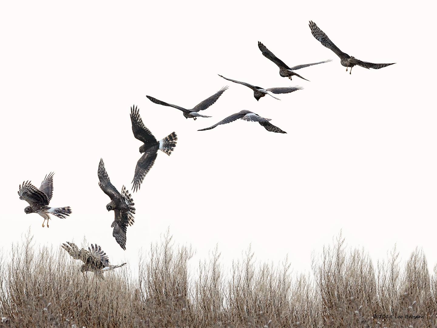 Ik kon enkele seconden dit vrouwtje blauwe kiekendief door mijn camera volgen. Nam diverse opnames en had de mazzel dat plotseling naar een vermeende prooi werd gedoken. Helaas voor haar vergeefs want met niets in de klauwen vervolgde ze haar weg. Middels Photoshop kon ik een samenstelling maken van de vlucht. Dit geeft een goede impressie van de manier waarop een kiekendief jachtvluchten maakt.