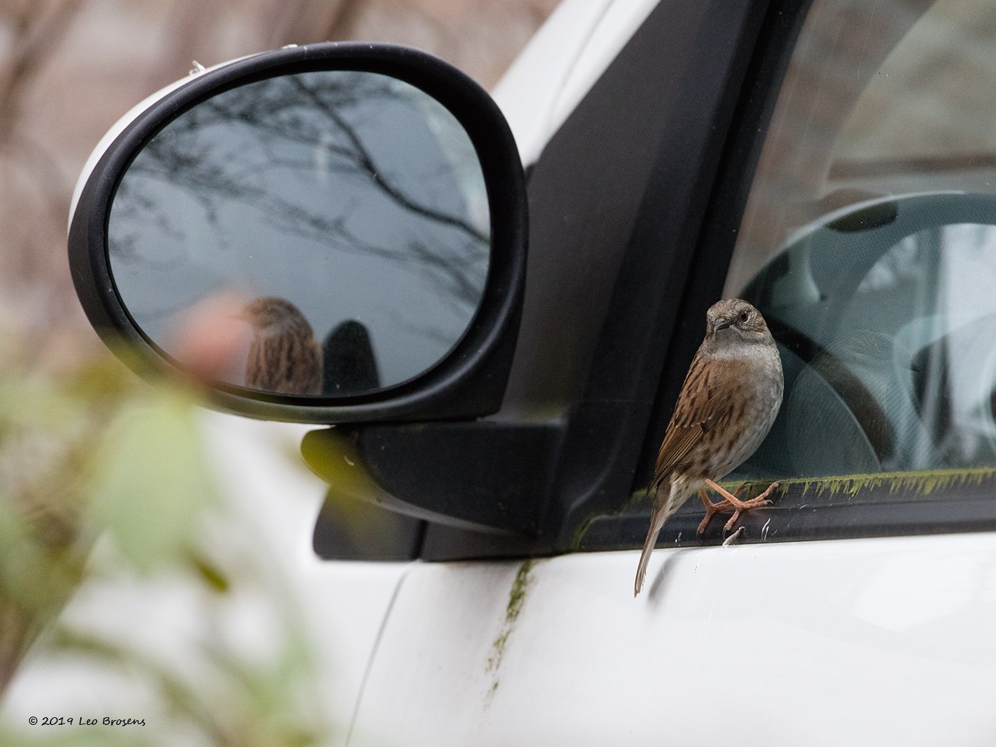 Een zachte winter, mooi weer, het voorjaar meldt zich. Dat voorjaar is in het koppie van deze heggenmus gekropen. De hormonen werden opgestart en nu is ie kwaad op van alles. Ook op zijn eigen spiegelbeeld dat ie ziet in de autoruit en in de autospiegel. We zagen de heggenmus allemaal bezig bij die spiegel. Om de zoveel minuten kwam ie zich even druk maken, de poepjes op de spiegel verraden dat ook. Toch maar geprobeerd er een foto van te maken. Daarom voorzichtig met camera de tuin in geslopen en mijn geduld getest. Het lukte om deze plaatjes te maken, deels door de struiken heen. Op de spiegel zittend boog ie steeds voorover om te zien waar de concurrent zat daar in die spiegel. Zittend bij het raam had ie het helemaal niet meer, daar zag ie zelfs drie concurrenten, een spiegelbeeld voor hem in het raam plus twee in de spiegel, een van hem en een van zijn spiegelbeeld. Even later zag ik een tweede heggenmus, vast een dame want de achtervolging en begroeting werd ingezet. Komt dus vast goed met de heggenmus bij ons in de tuin.