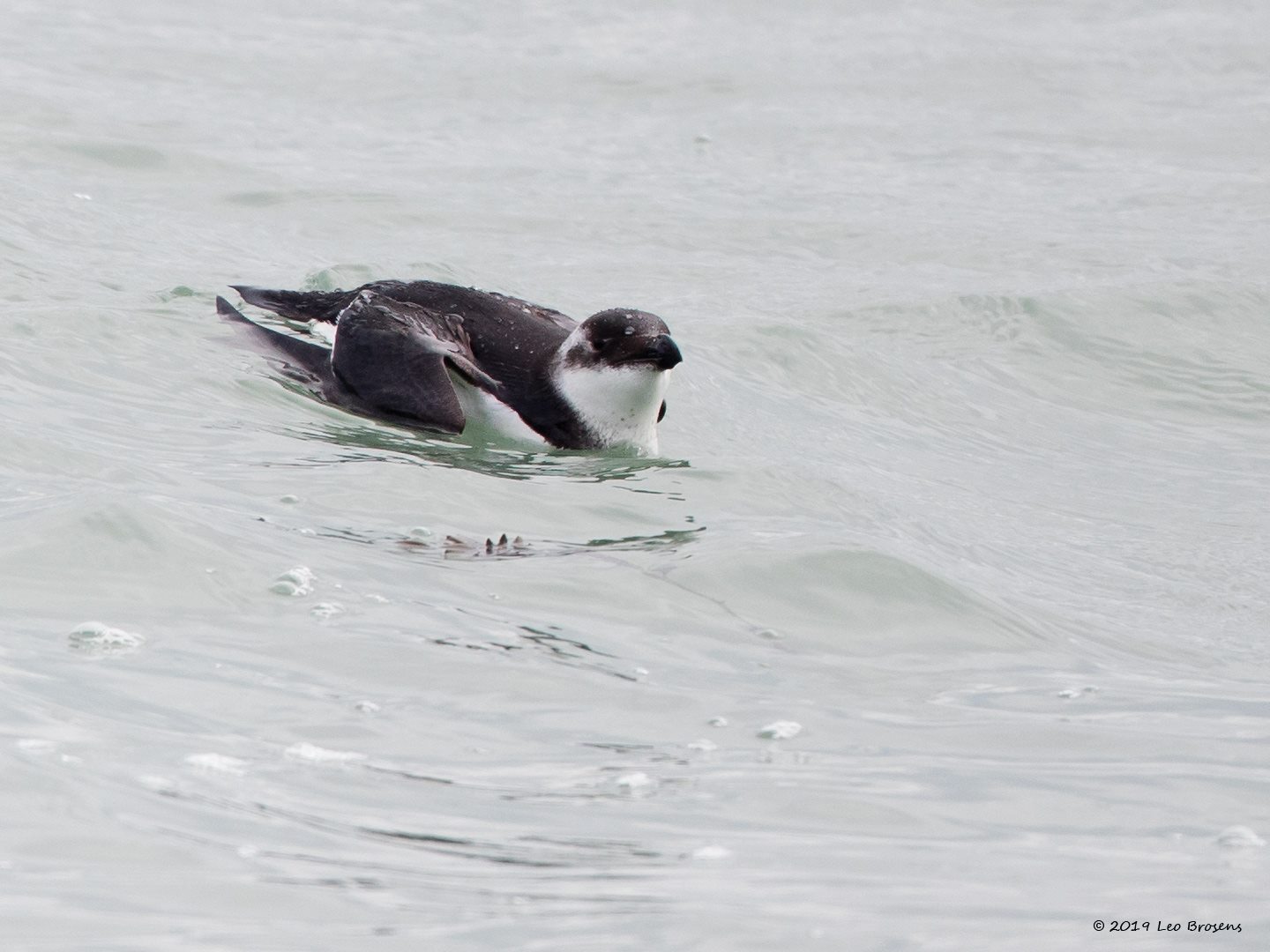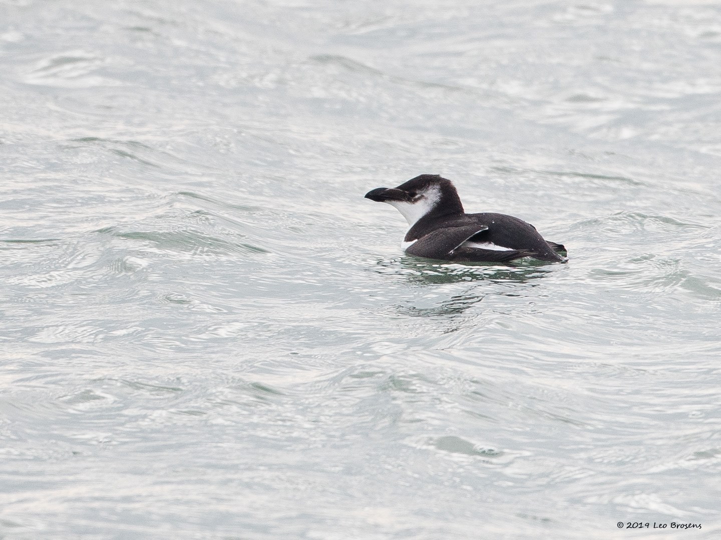 Er waren enkele alken druk bezig met foerageren. Dan valt het nog niet mee om ze op te foto te krijgen. Ze zitten immers niet zo dicht bij de dijk en zijn steeds maar even boven water en waar ze weer opduiken is steeds een gokje. Ze vissen op kleine vissoorten, zoals spiering en haring, en kreeftachtigen die worden opgedoken van soms een aanzienlijke diepte. Ze zijn onder water echt rap, komt omdat ze poten en vleugels gebruiken bij het zwemmen. Je kunt ook zeggen dat ze onder water eveneens vliegen, met korte krachtige vleugelslagen duwen ze zich steeds af tegen het water. Op deze foto kun je het vleugelgebruik een beetje herkennen, de smalle sterke vleugels worden al een beetje open gehouden zodat met een paar vleugelslagen er al weer een spierinkje het haasje is.