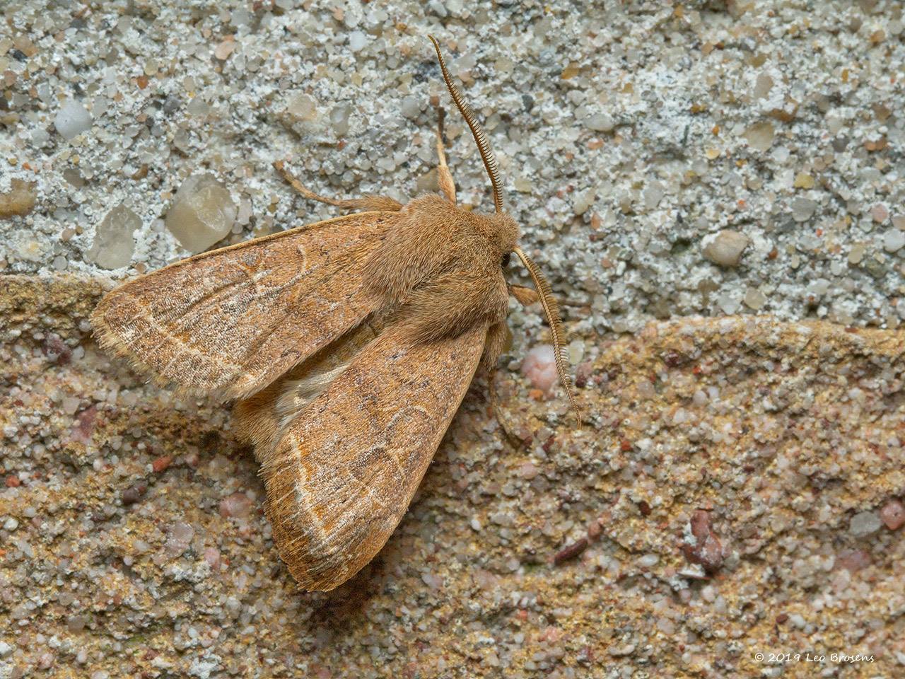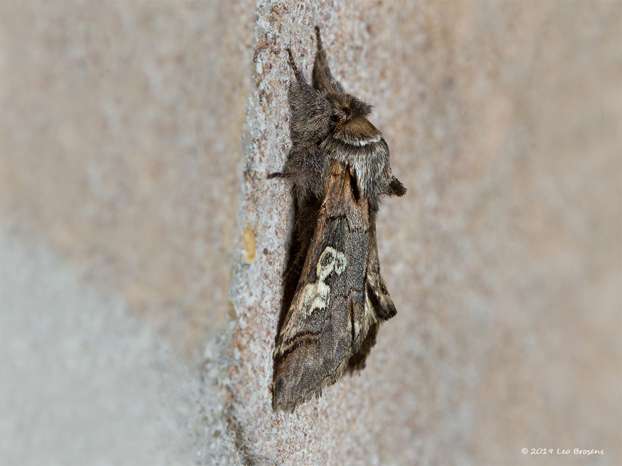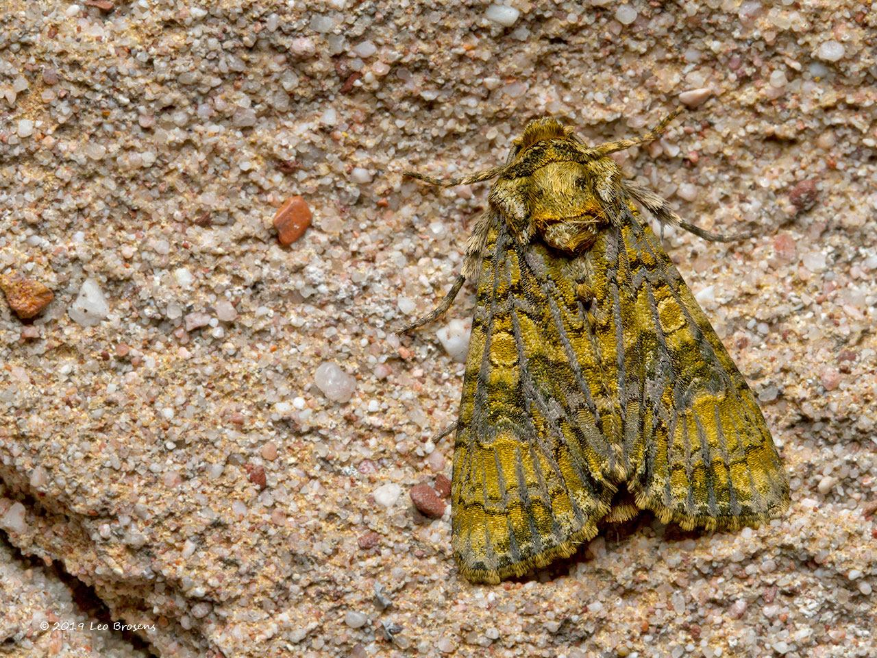 Nog een of twee weken en dan tref je deze mot niet meer aan, de vliegtijd is immers van half juli tot half oktober. Deze mooie nachtvlinder wil best op licht afkomen. Zo kwam deze op de muur bij onze buitenlamp zitten, de voegen zijn een goede referentie voor de grootte van de mot. Ze komen als het donker is, ik heb dus moeten flitsen om hem op de plaat te zetten. Door het heldere flitslicht wordt de mot eerder mooier, levendiger van kleur, dan onder normale licht omstandigheden denk ik. Op de mooie en leerzame site van de Vlinderstichting is meer te lezen over deze uil (Noctuidae). Zoals; de rups boort zich een weg in de onderste delen van de stengel van de waardplant, waar ook de verpopping plaatsvindt. De soort overwintert als ei.