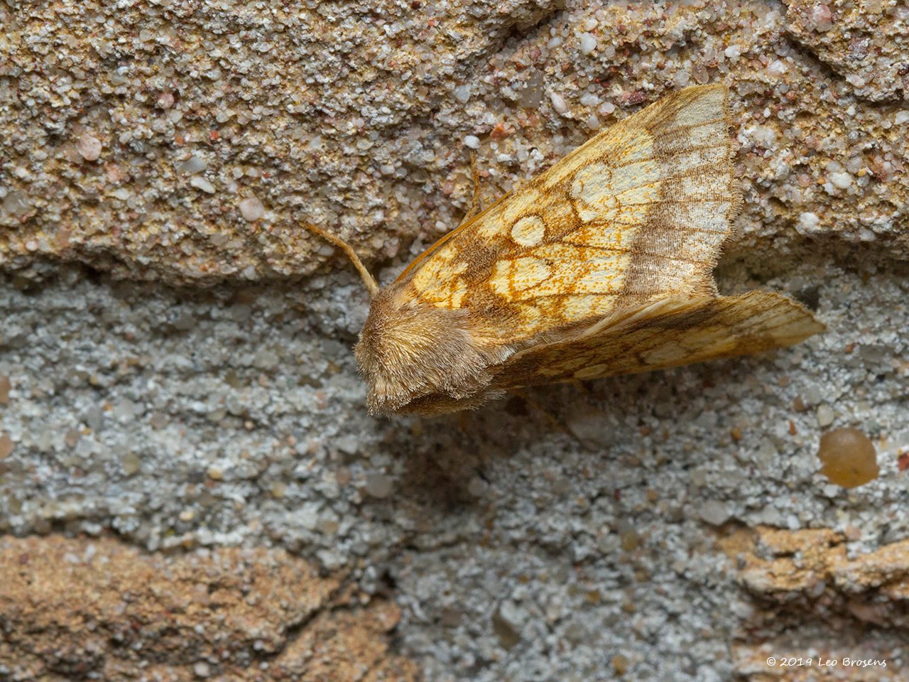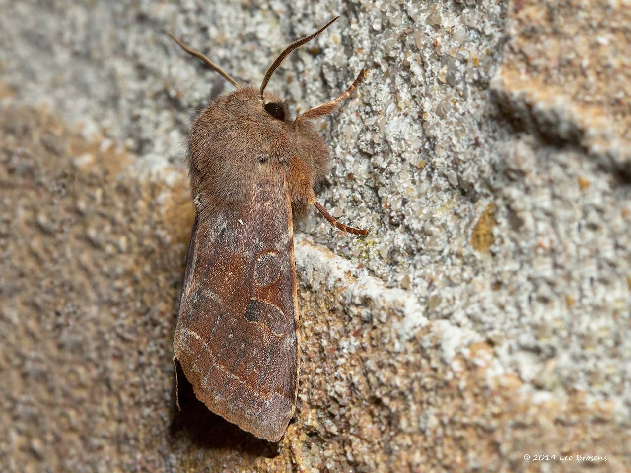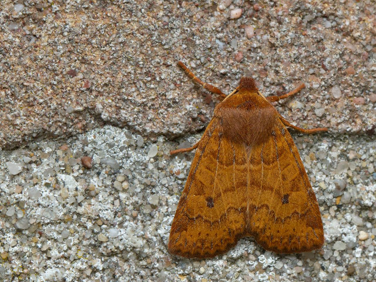 Nog een of twee weken en dan tref je deze mot niet meer aan, de vliegtijd is immers van half juli tot half oktober. Deze mooie nachtvlinder wil best op licht afkomen. Zo kwam deze op de muur bij onze buitenlamp zitten, de voegen zijn een goede referentie voor de grootte van de mot. Ze komen als het donker is, ik heb dus moeten flitsen om hem op de plaat te zetten. Door het heldere flitslicht wordt de mot eerder mooier, levendiger van kleur, dan onder normale licht omstandigheden denk ik. Op de mooie en leerzame site van de Vlinderstichting is meer te lezen over deze uil (Noctuidae). Zoals; de rups boort zich een weg in de onderste delen van de stengel van de waardplant, waar ook de verpopping plaatsvindt. De soort overwintert als ei.