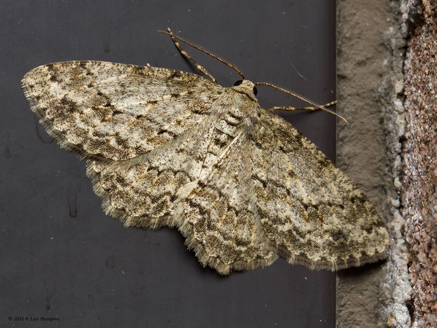 Ik zag deze spanner in het voorjaar vaak bij onze buitenlamp. Voor een spanner houdt ie de vleugels in rust best ver over elkaar. Veel nachtvlinders zien er niet echt spectaculair uit, deze soort ook niet. Ik trof ze aan meestal op de muur bij de lamp maar ook wel op een plant en op een raam in de nabijheid van de lamp. Steeds in het donker, de foto's zijn dan ook steeds met flits gemaakt.