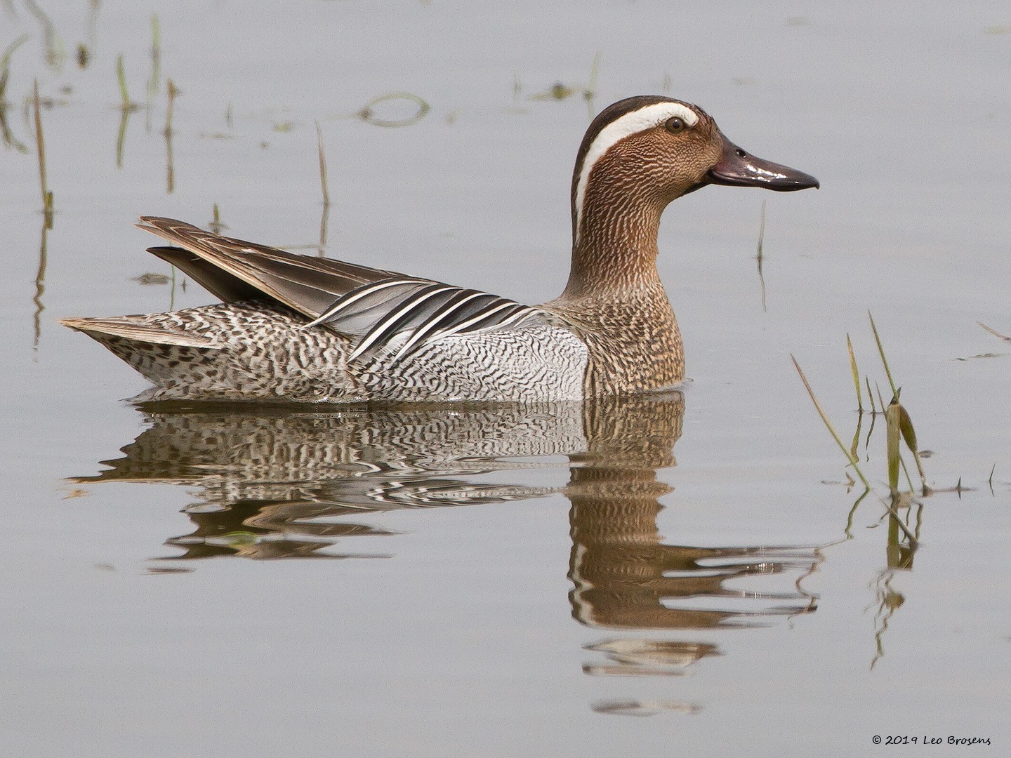 Een van mijn favoriete eendjes. Niet groot zijn ze, ca. 35 cm groot en 350 gram, daarmee de kleinste eend die in Europa voorkomt. Gelukkig niet zeldzaam, ik zag er weer een heleboel gisteren daar aan de Gortzakweg aan het eind van de Oesterdam daar vooraan in Zeeland. Het bruin van het kruintje van dit mannetje past mooi bij de kleur van de verweerde planten in het ondiepe water. Er is nog net iets van het groene spiegeltje in de vleugel te zien.