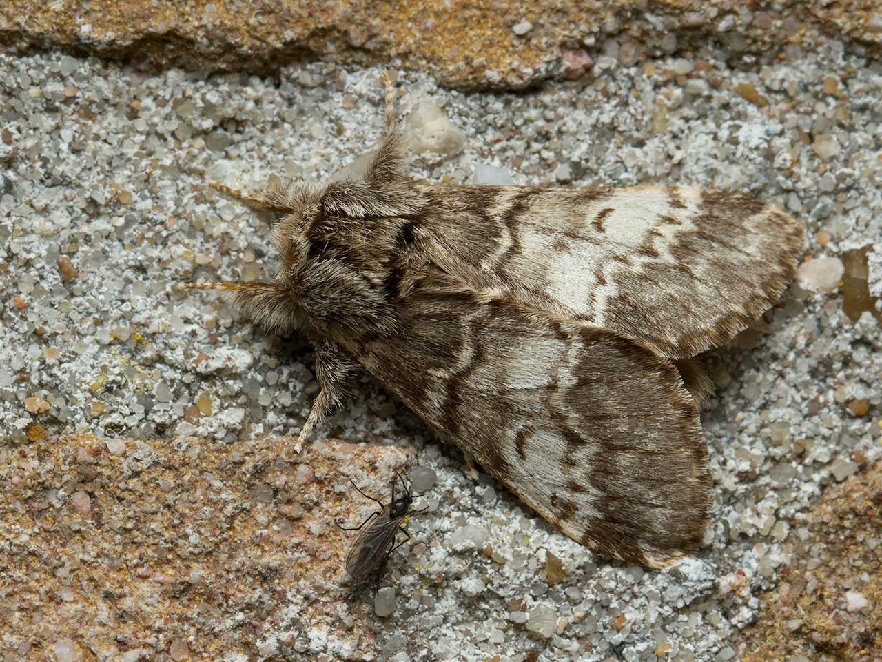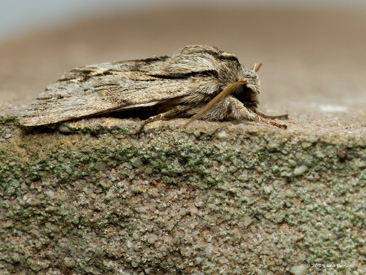 Deze dik aangeklede nachtvlinder heet 'kromzitter'. Dat terwijl hij gewoon normaal op de muur zit bij onze buitenlamp. Die naam heeft ie dan ook te danken aan zijn eerdere persoonlijkheid, aan de rups. Voelt de rups zich op zijn gemak dan zit ie namelijk steeds met het achterlijf gekromd omhoog gehouden, vandaar dus. De kromzitter vliegt maar goed een dikke maand, zo rond oktober en november. Dan komt ie bij ons best veel voor. Onze streek is wel de grens van zijn verspreidingsgebied, heel algemeen in het oosten van ons land, zo goed als niet voor komend in het westen. Dus wel in richting Tilburg en niet meer in richting Roosendaal.