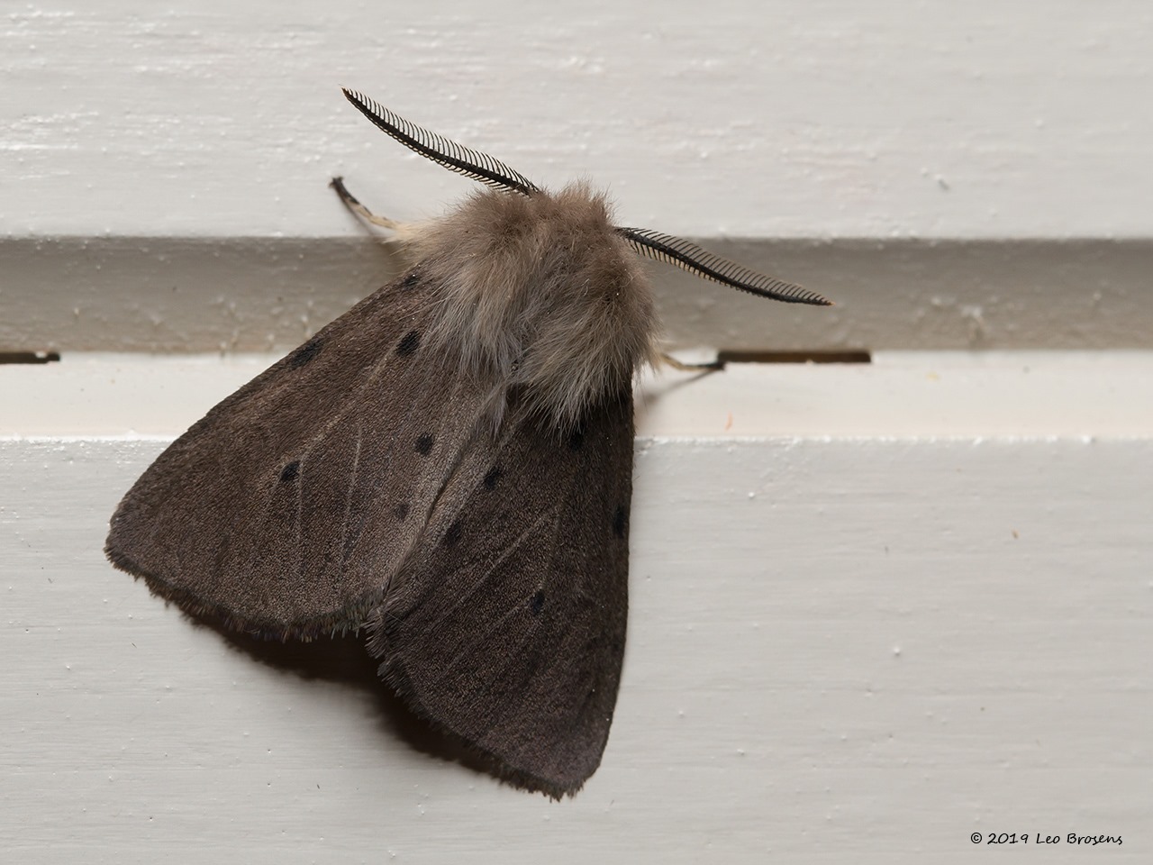 Ik ben overigens wel blij dat ie bij ons op visite kwam bij de buitenlamp want deze soort komt hier niet veel voor. Dit is een mannetje te herkennen aan de grote antennes, het vrouwtje heeft die niet. Niet nodig, meneer moet haar maar zien te vinden anders pech gehad. Meneer vliegt zoekend rond van eind augustus tot half november in één generatie. Deze foto's zijn gemaakt op 7 oktober. Overigens komen ze in heel Europa voor met uitzondering van Noord-Scandinavië en IJsland. Oostwaarts tot de Oeral en de Kaspische Zee. Zuidelijk via Turkije en Armenië tot Iran, Syrië, Libanon, Jordanië en Israël.