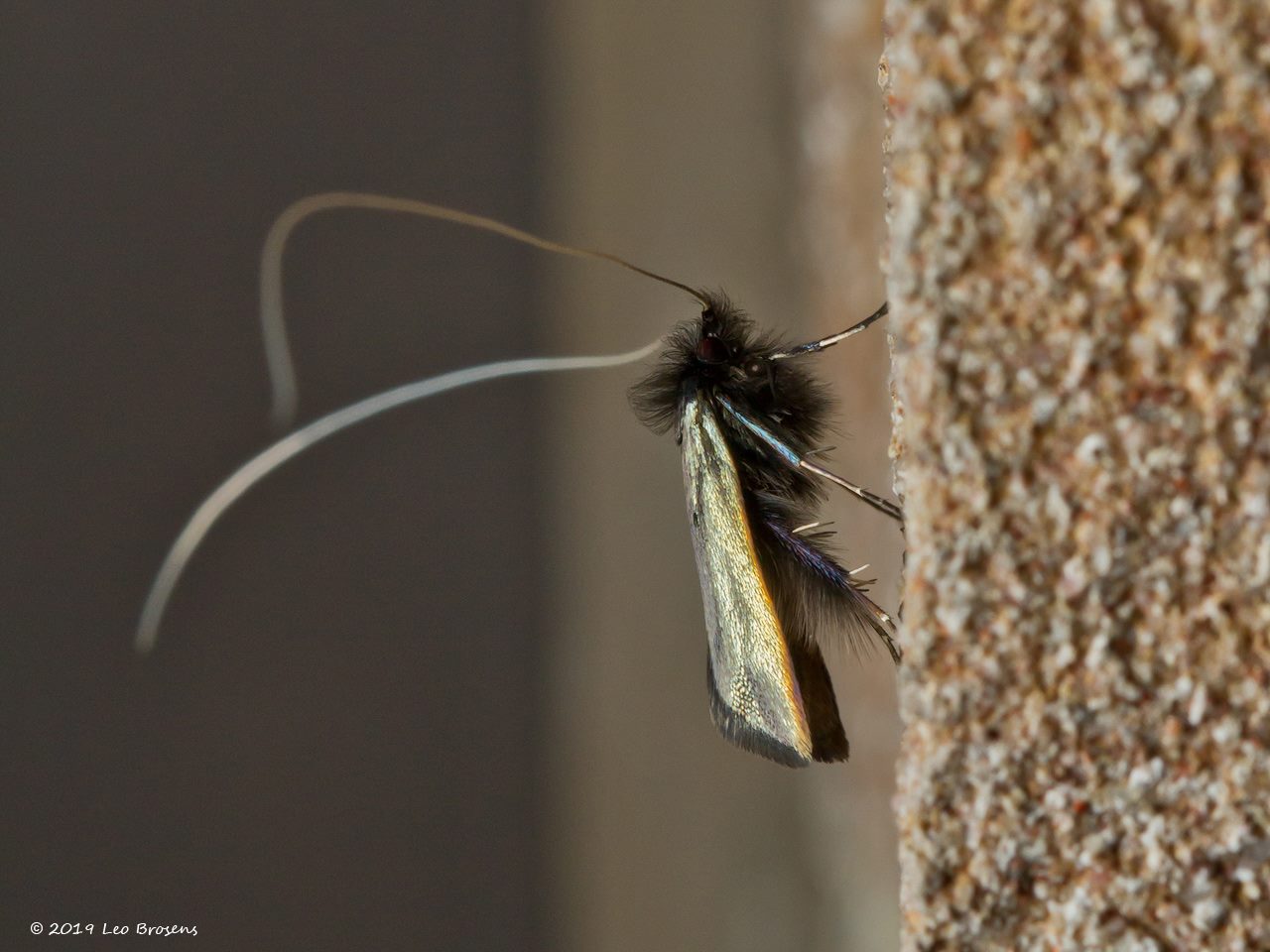 Nog eenmaal een vedermotje. Deze windevedermot landde in het donker bij onze buitenlamp. Op de muur fotografeerde ik hem en daarbij vloog ie op en vloog ie naar binnen in ons portaaltje. Daar op het stuckwerk maakte ik deze foto's. Heel goed is te zien hoe iel deze beestjes gebouwd zijn. Als je de bevedering, de beharing, weg denkt dan houd je al helemaal niets over. Toch werkt alles, ook de spiertjes voor pootjes en vleugels. Ik wou dat mijn spiertjes net zo efficient waren als van deze insecten, dan had ik al heel wat olympische medailles gescoord denk ik. Nu moeten we de eer aan deze beestjes laten.