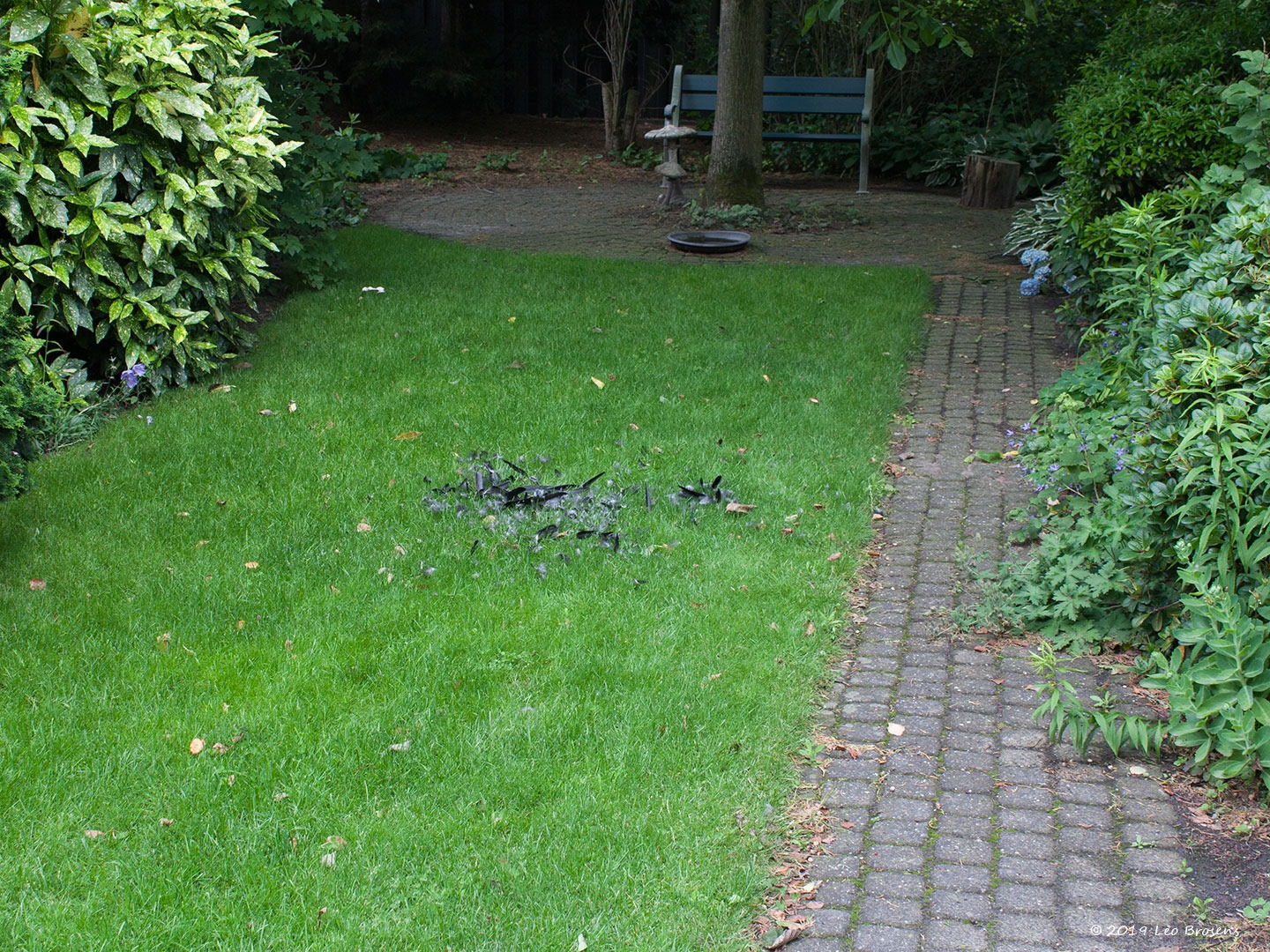 Toen ik dinsdag opstond en met mijn slaperige ogen de tuin in keek zag ik op ons gazonnetje iets liggen. Ik kon niet goed zien wat het was, iets van een plastic zakje of zo dacht ik. Helaas bleek het een dode tortel te zijn. Mooi liggend op de rug met de pootjes omhoog. Ik kon geen enkele verwonding zien. Later zagen we op het raam van de schuifpui een stoffig vogelsilhouet, grote kans dat de tortel tegen dat raam is gevlogen met uiteindelijk fatale afloop? Wellicht was het de tortel hier op de foto die ik afgelopen april in onze tuin fotografeerde. Trouwe welkome tuinvriendjes zijn het die paar tortels die bij ons in de tuin wonen. Helaas nu eentje minder maar ik vermoed dat die plaats snel door een andere zal zijn ingenomen.