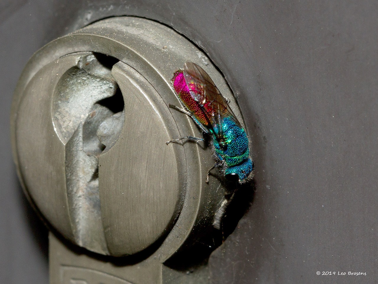 Een van de mooiste vliesvleugeligen vind ik de goudwespen. De metaalachtige blauwe, groene of rode kleur van het pantser vind ik bijzonder. Ik zie ze heel weinig in onze tuin. Een keer op onze achterdeur waarbij het slot nader werd onderzocht. Ik denk dat het kleine wespje wilde weten of het sleutelgat wellicht door een ander insect als broedplaats werd gebruikt. De goudwesp is namelijk een parasiet. De eieren worden afgezet in nesten van solitaire bijen en wespen en komen direct uit. Vervolgens beginnen de larven te eten van de voedselvoorraad en de larven van hun gastheer. Ze komen wereldwijd voor en kunnen echt klein zijn, van 0,2 tot 2 cm groot. Mocht je in de tuin een insectenhotel of iets dergelijks hebben dan moet je deze maanden daar goed opletten. Ze willen daar namelijk nogal eens een geschikt slachtoffer vinden om hun parasietengedrag in praktijk te brengen.
