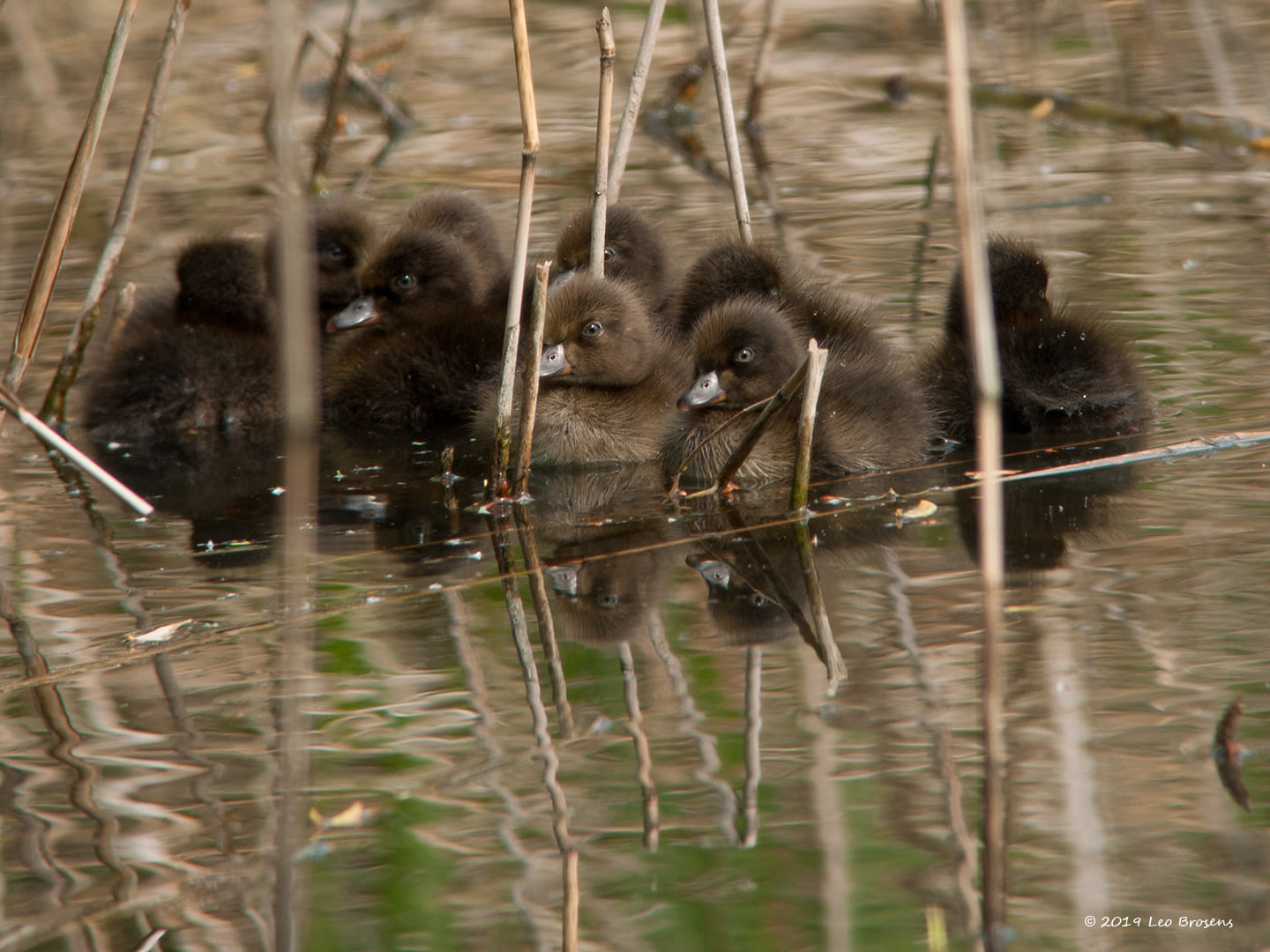 De kuifeend is talrijk. Komt mede omdat ze niet te moeilijk doen bij het vinden van een broedplek. Dat broeden lukt ze dus vrij aardig. Hier zien we een resultaat daarvan. Altijd leuk zo'n groepje kleuters. Er zijn nog geen kleuren te onderscheiden, ook nog geen geel in het oog te zien.