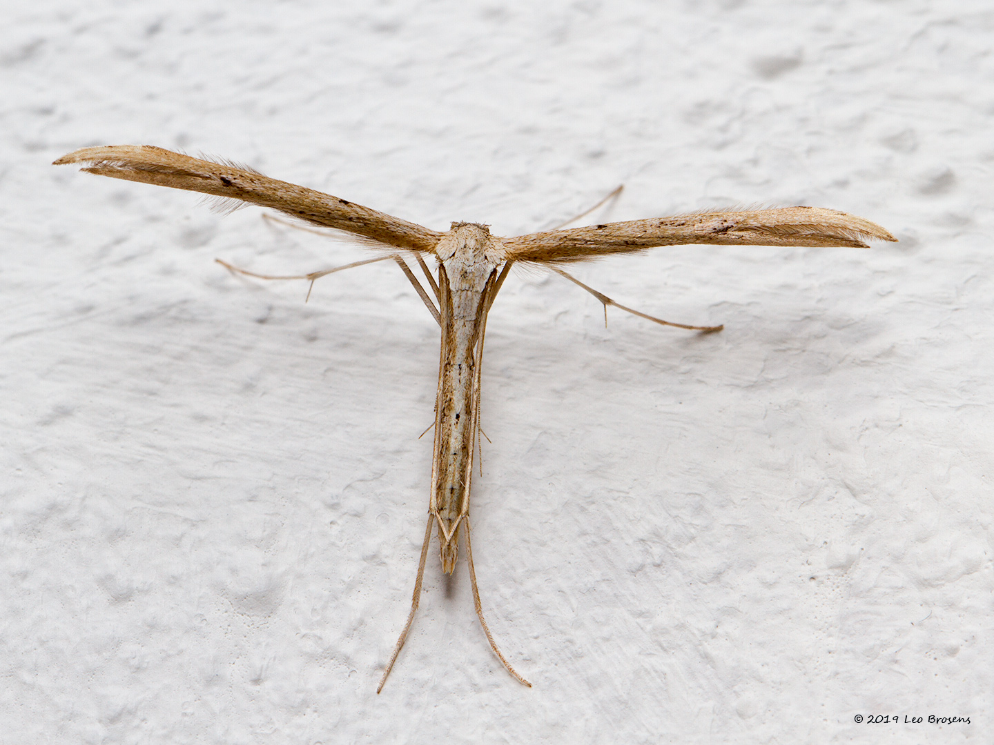 Iedereen kent wel onze dagvlinders. Een aantal kennen ook wel enkele nachtvlinders. Maar nog veel minder mensen kennen de kleinere nachtvlinders, de micro motten. Daar zijn er toch wel ca. 1500 soorten van. Ook met bijzondere bouw, zoals deze vedermot. Deze vedermotten (Pterophoridae) zijn bijzondere motten qua vorm. Ze hebben een lang en slank lichaam, de poten zijn ook lang met opvallende vertakkingen en de vleugels zijn smal en vormen samen met het lichaam in rusthouding een T. Kenmerkend zijn hun diep gespleten vleugels waardoor drie onderdelen ontstaan elk met een brede franje. Het zijn nachtvliegers, de vliegperiode is van juni tot september, deze foto nam ik op 16 september op het trespa boven aan de keukenuitbouw. Waardplant is vooral munt, salie, ogentroost. De spanwijdte van de vlinder bedraagt tussen de 17 en 23 millimeter. De soort overwintert als imago.