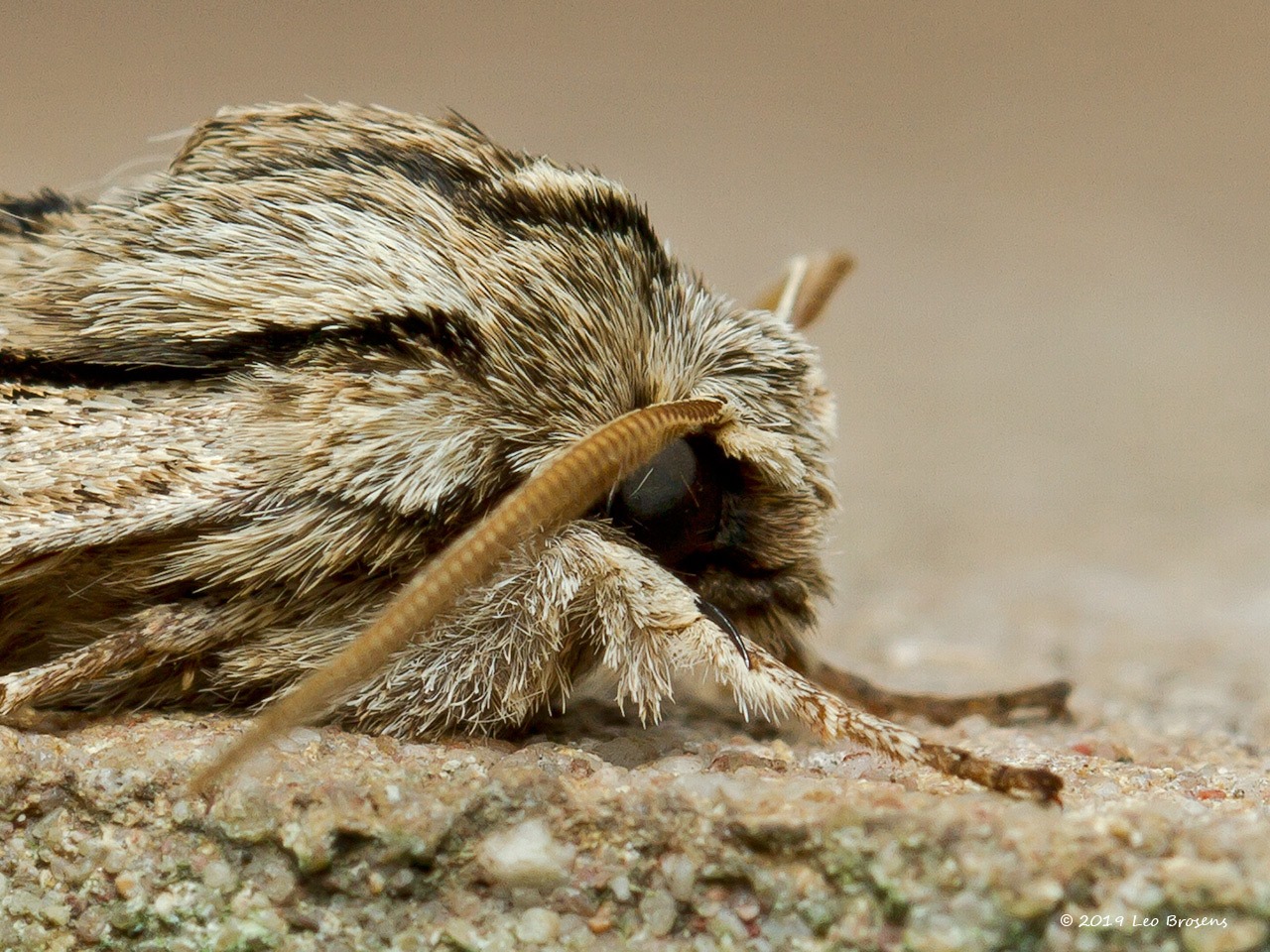 Deze nachtvlinder is een buitenbeen. Eigenlijk letterlijk want op het dijbeen van de voorpoten heeft deze vlinder een grote klauw of nagel staan. Duidelijk te zien op de foto. Waarom die daar zit, niemand heeft een goede verklaring. Die nagel lijkt dus een foutje in het dna van dit diertje waardoor bij de ombouw van de kromzittende rups de vlinder nog een lichaamsonderdeeltje opgebouwd krijgt dat nergens meer goed voor is. Noemen we zoiets niet een rudimentair ding, zoals onze blinde darm. Kortom, een geval apart.