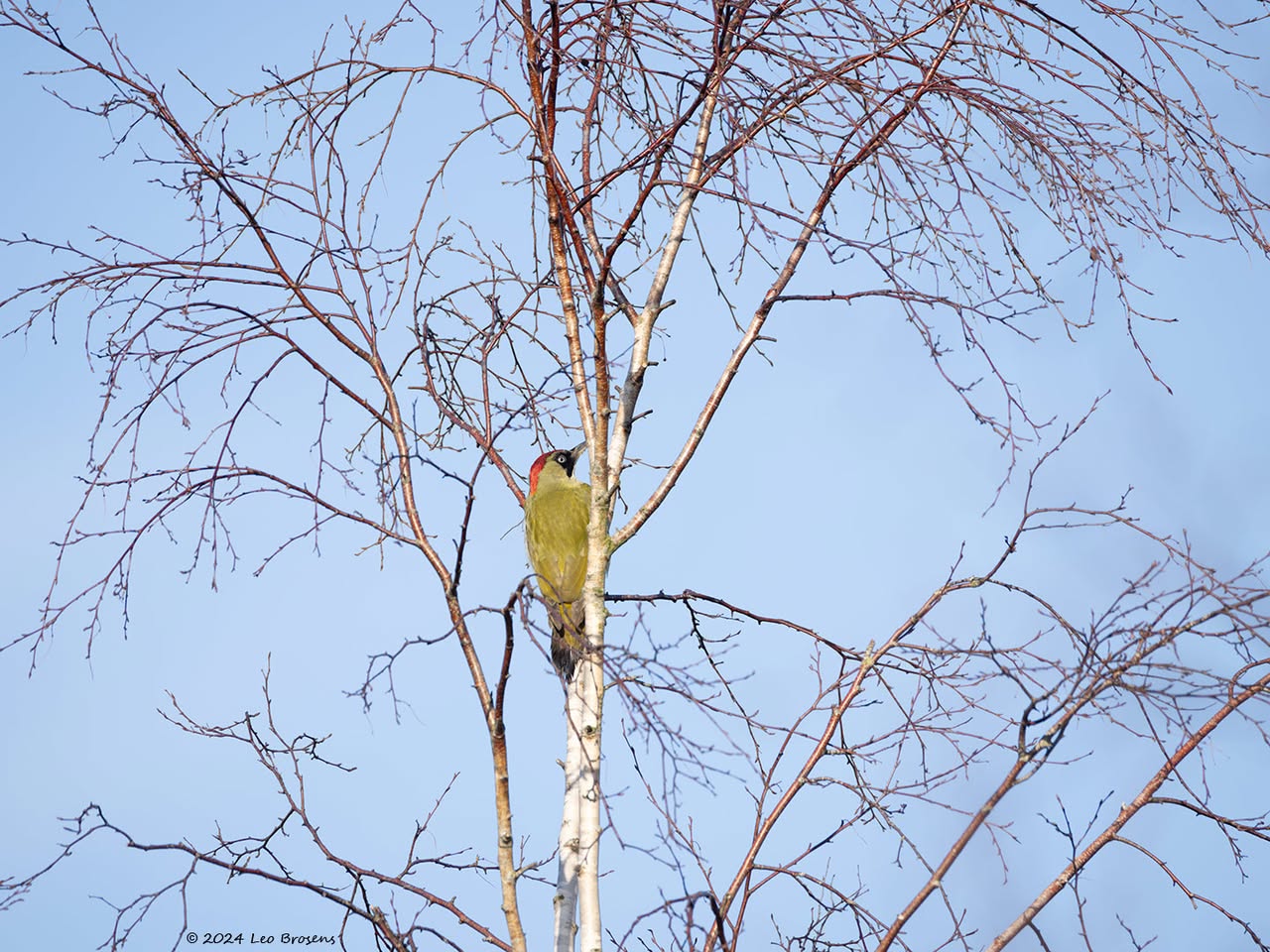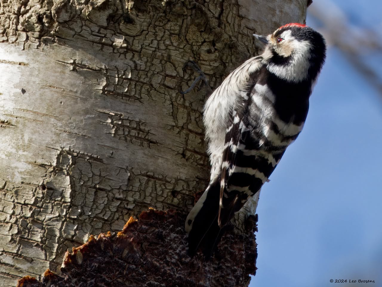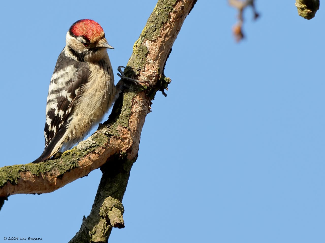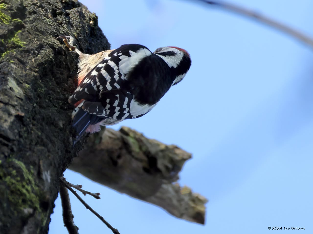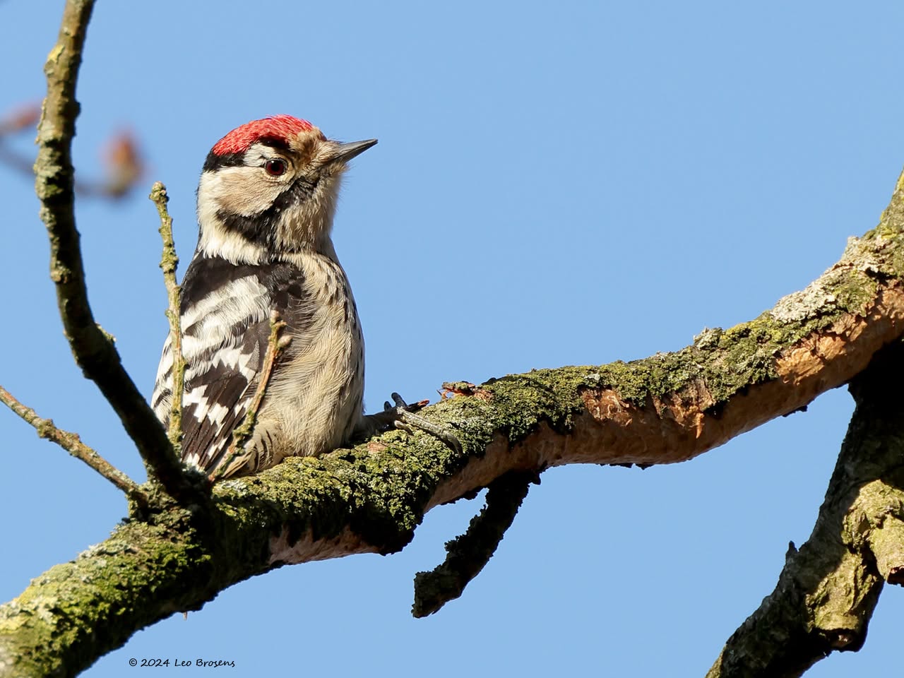 Precies een week geleden scheen de zon rond de middag, echt waar. Toen spotte ik deze kleine specht hoog in een boom in de Waaienberg. Klein betekent hier een lichaamslengte van 14 tot 16 cm, de vleugels geheel gespreid meet een spanwijdte van 25 tot 27 cm. De soort is duidelijk seksueel dimorf wat betreft de koptekening. Alleen het mannetje heeft een rode kruin, aan de zijkanten gebiesd met een zwarte streep. Het vrouwtje heeft een geheel zwarte kruin en is dus geheel zwart-wit gekleurd. De rugtekening is ook kenmerkend. Let op het steunstaartje.