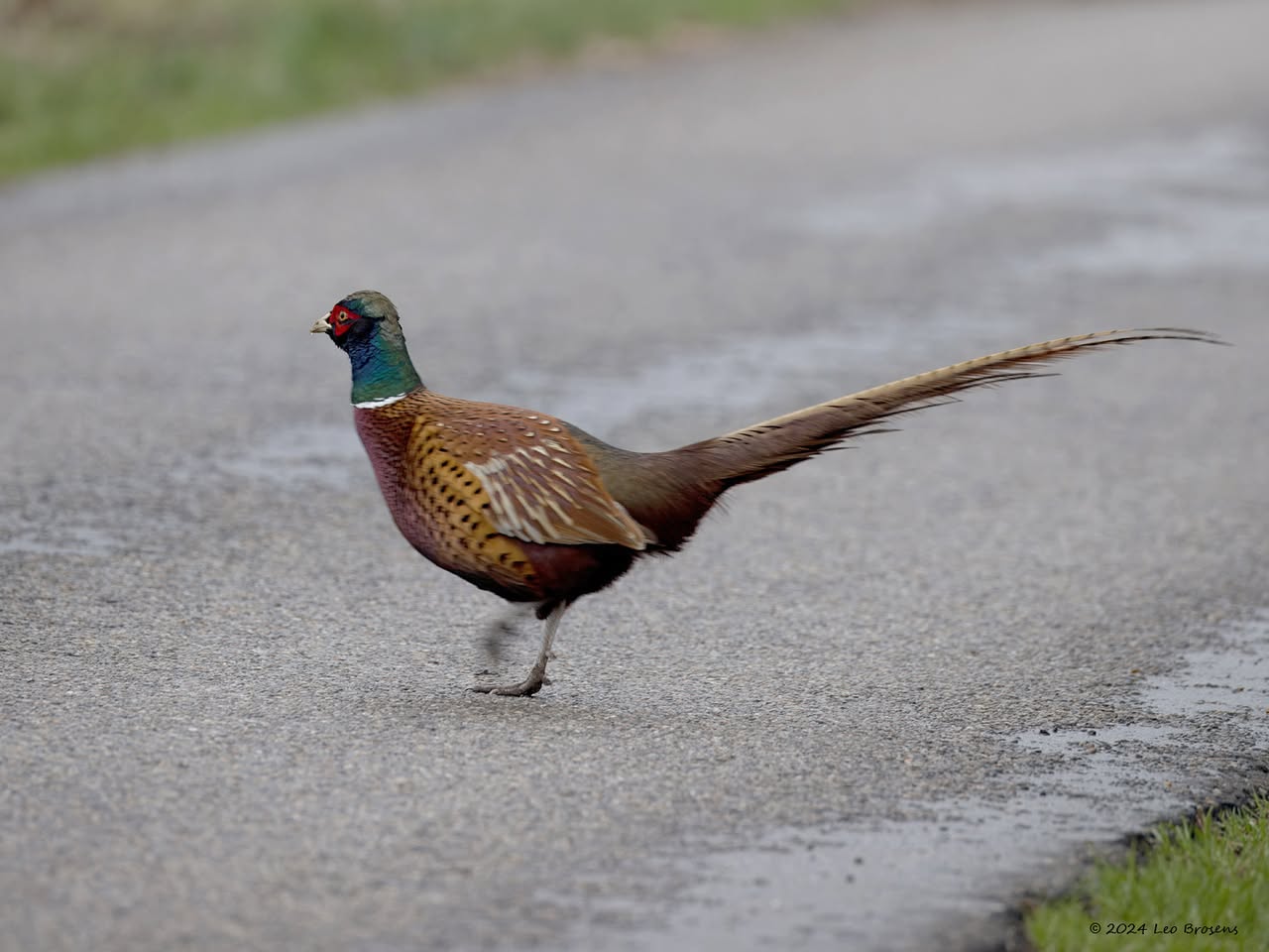 Deze vertrouwde exoot stak zaterdag de weg over bij de Leemskuilen. Gelukkig weinig verkeer en zo kon meneer langstaart aan de overkant doorgaan met zoeken naar mals groen of nog iets lekkerders.