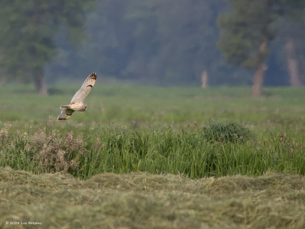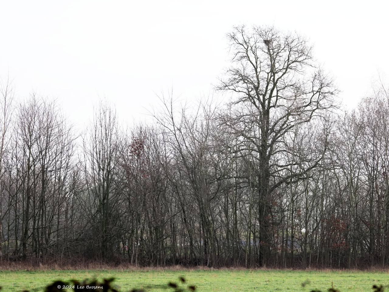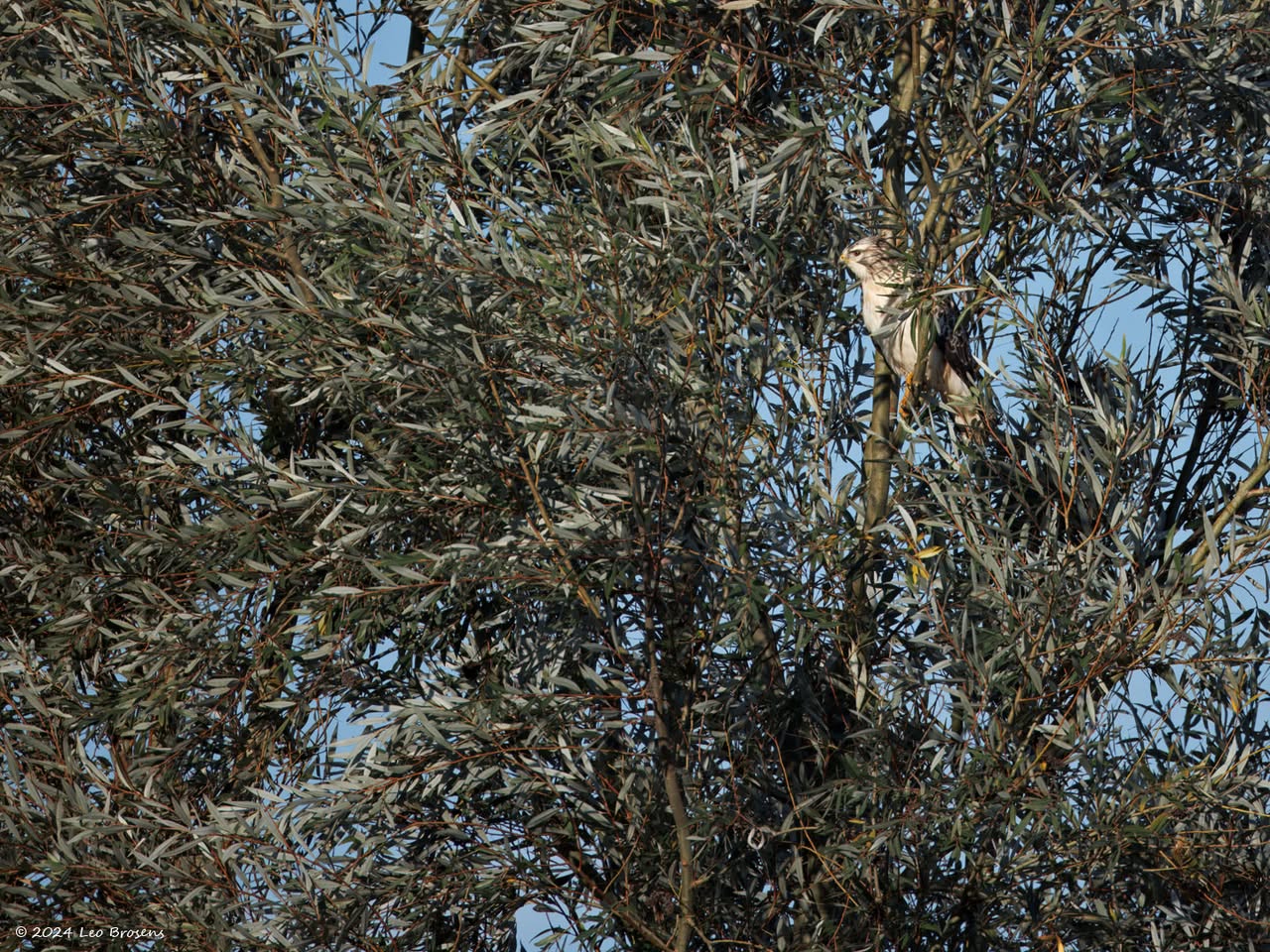 Een stukje natuur in de Pannenhoef, vanmorgen rond tien uur, met een zonnetje en met een buizerd in de top van een boom. Nog leuker wordt het als er een groep spreeuwen voor de buizerd voorbij vliegt. De buizerd vindt dat alles prima.
