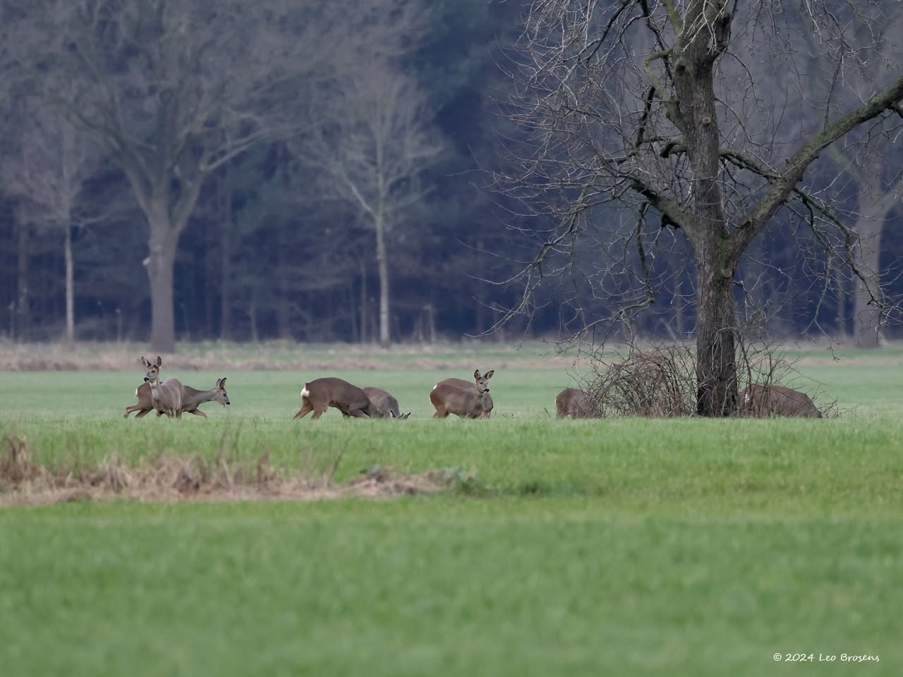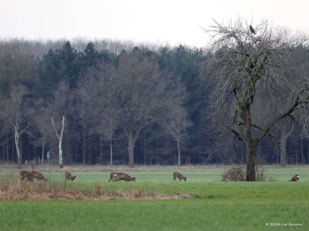 Vaak ben je al blij als je 1 ree ziet op je tocht. Vanmiddag kreeg ik er 13 op 1 foto, wel de oortjes mee tellen op de betreffende foto. Het was gewoon midden op de dag, om drie uur om precies te zijn. Wel op grote veilige afstand waardoor de buizerd ook nog even bleef zitten in de boomtop.