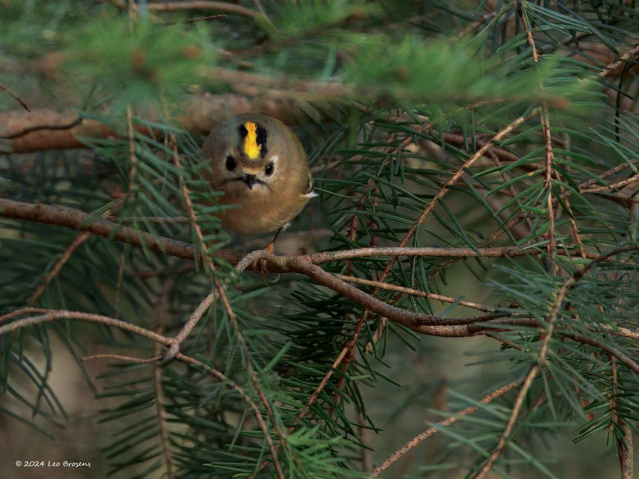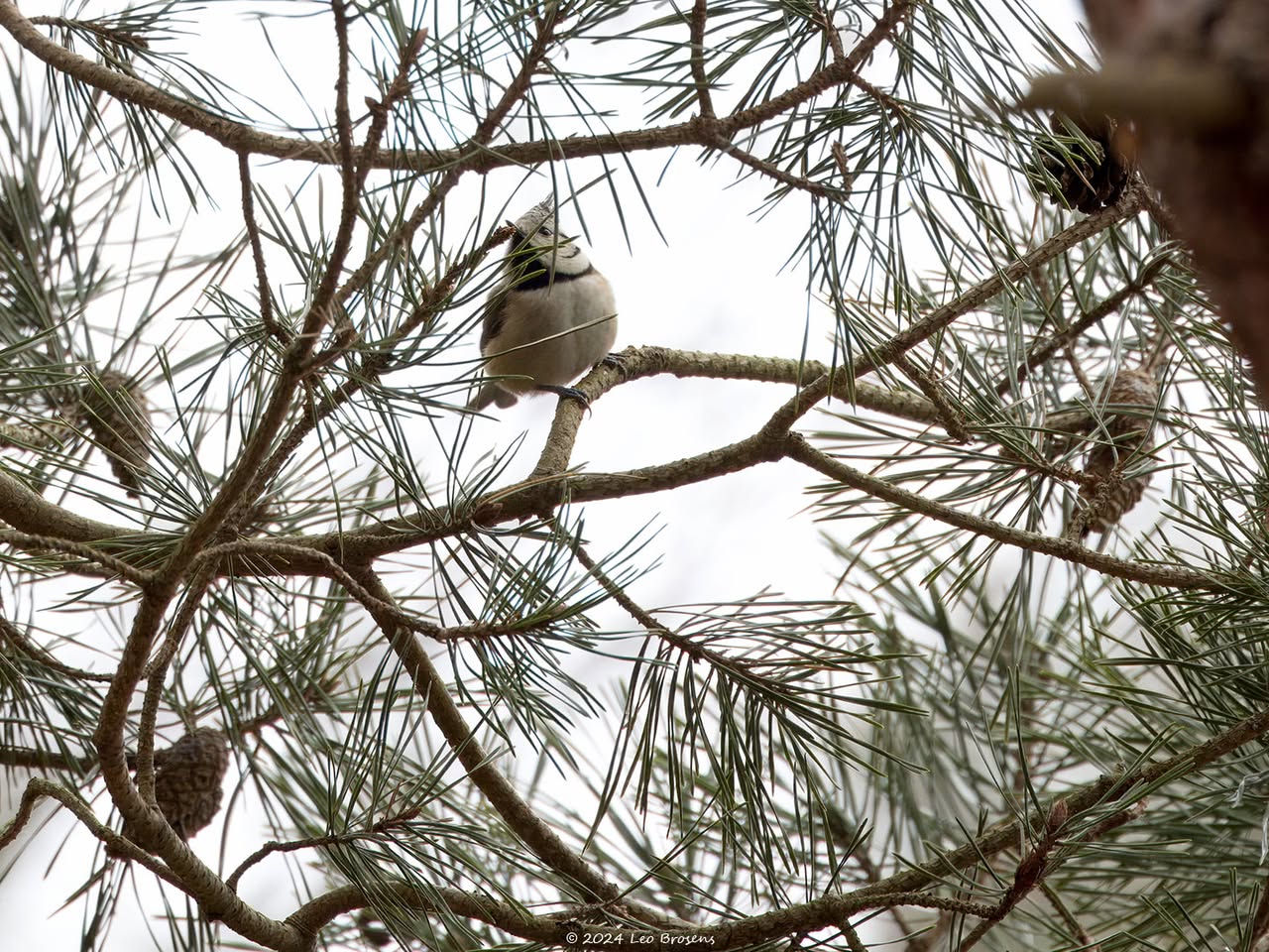 Niet alleen sijsjes zoeken in wintertijd naaldbomen af op iets eetbaars, ook pimpeltjes doen dat. Zo kon ik dit pimpeltje tijdens dat werk vastleggen. Bij goed kijken zag ik dat hij of zij iets aan de haak geslagen had, iets met de snavel te pakken had. Is dat nu een zaadje of een larfje, ze lusten beide nu. Ik denk een larfje, een heel klein rupsje?