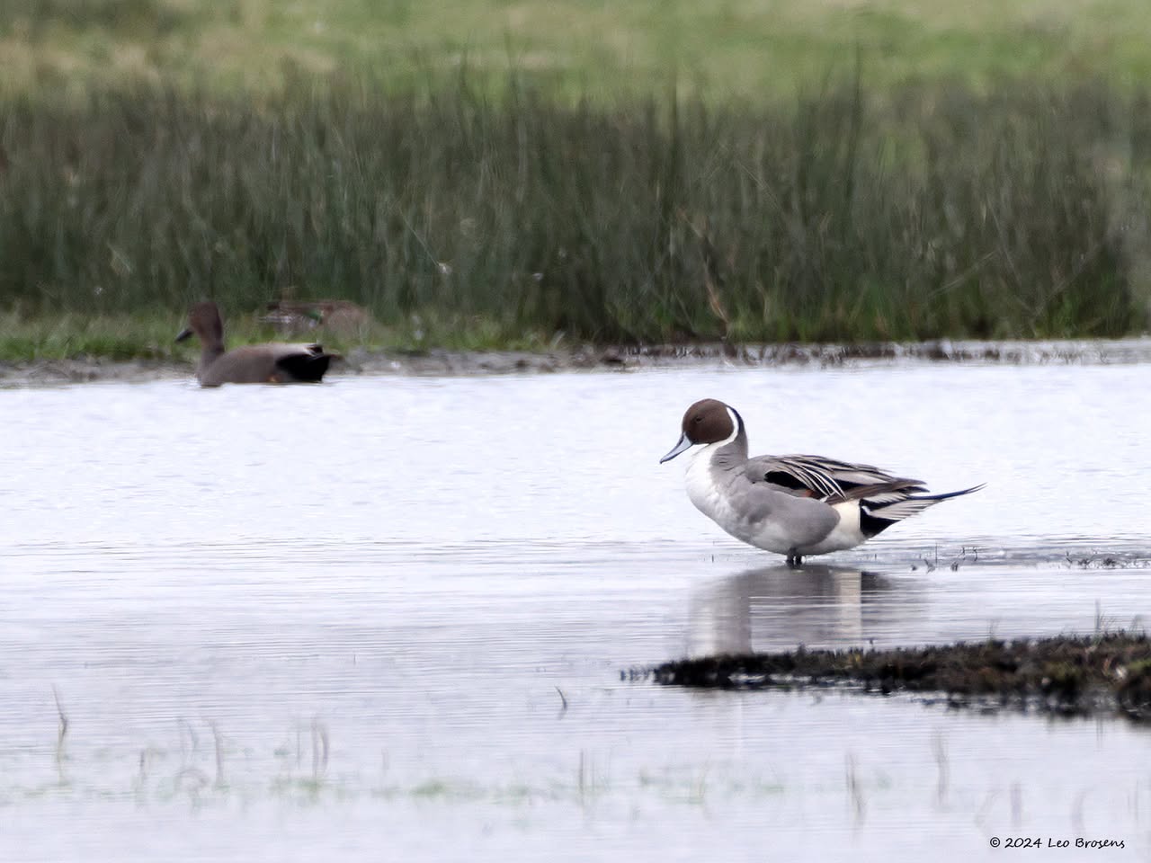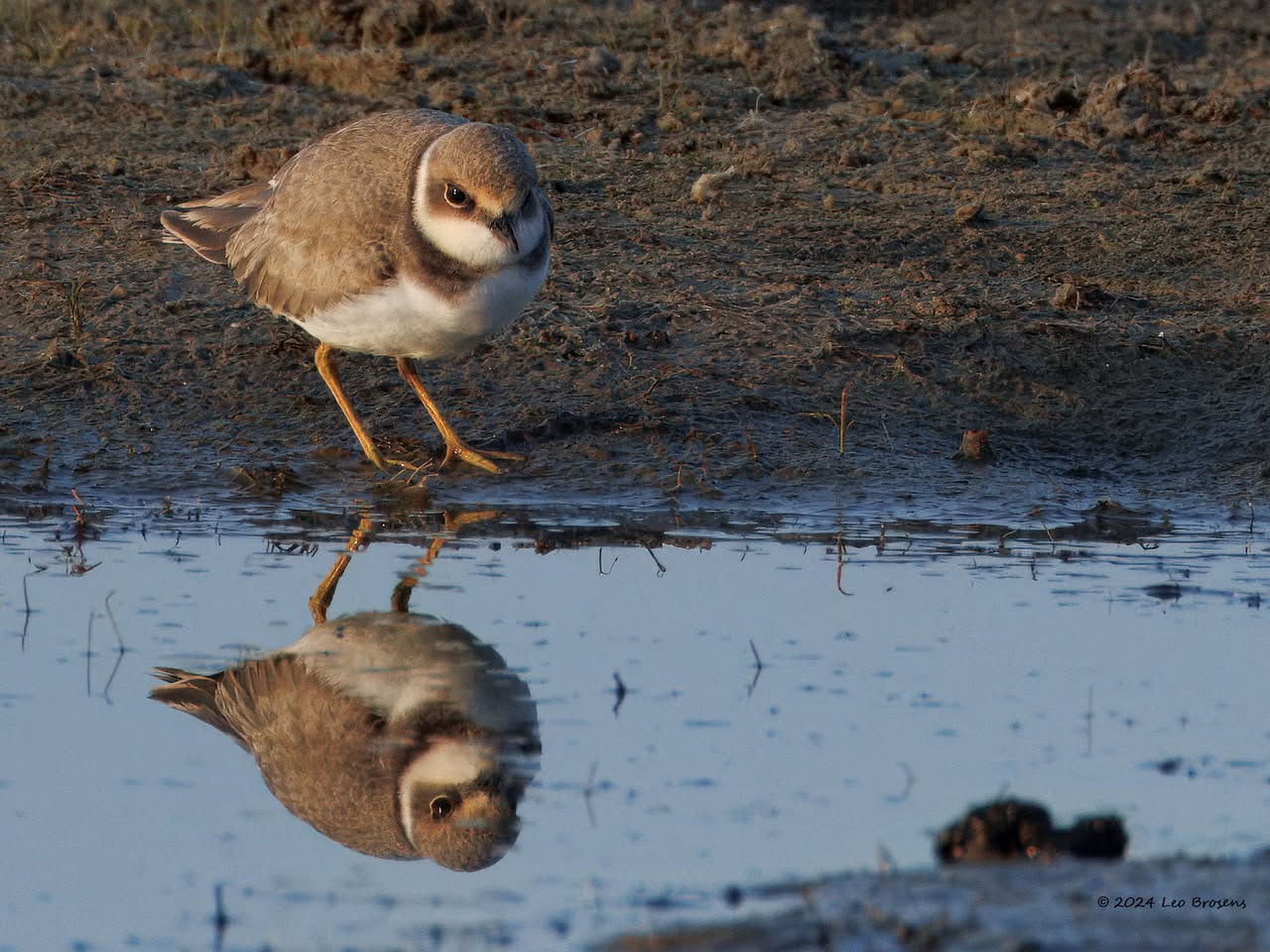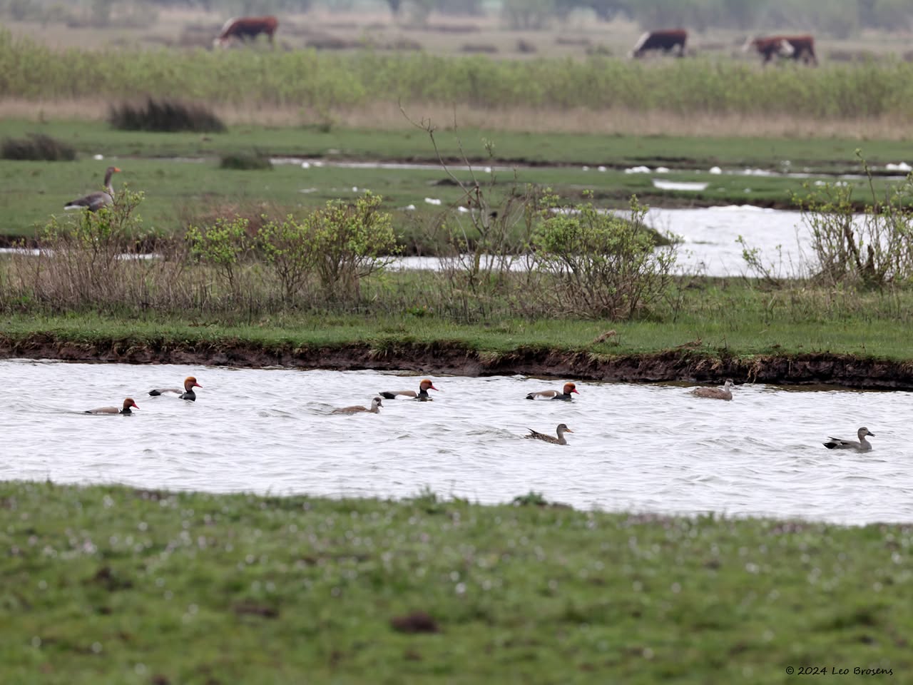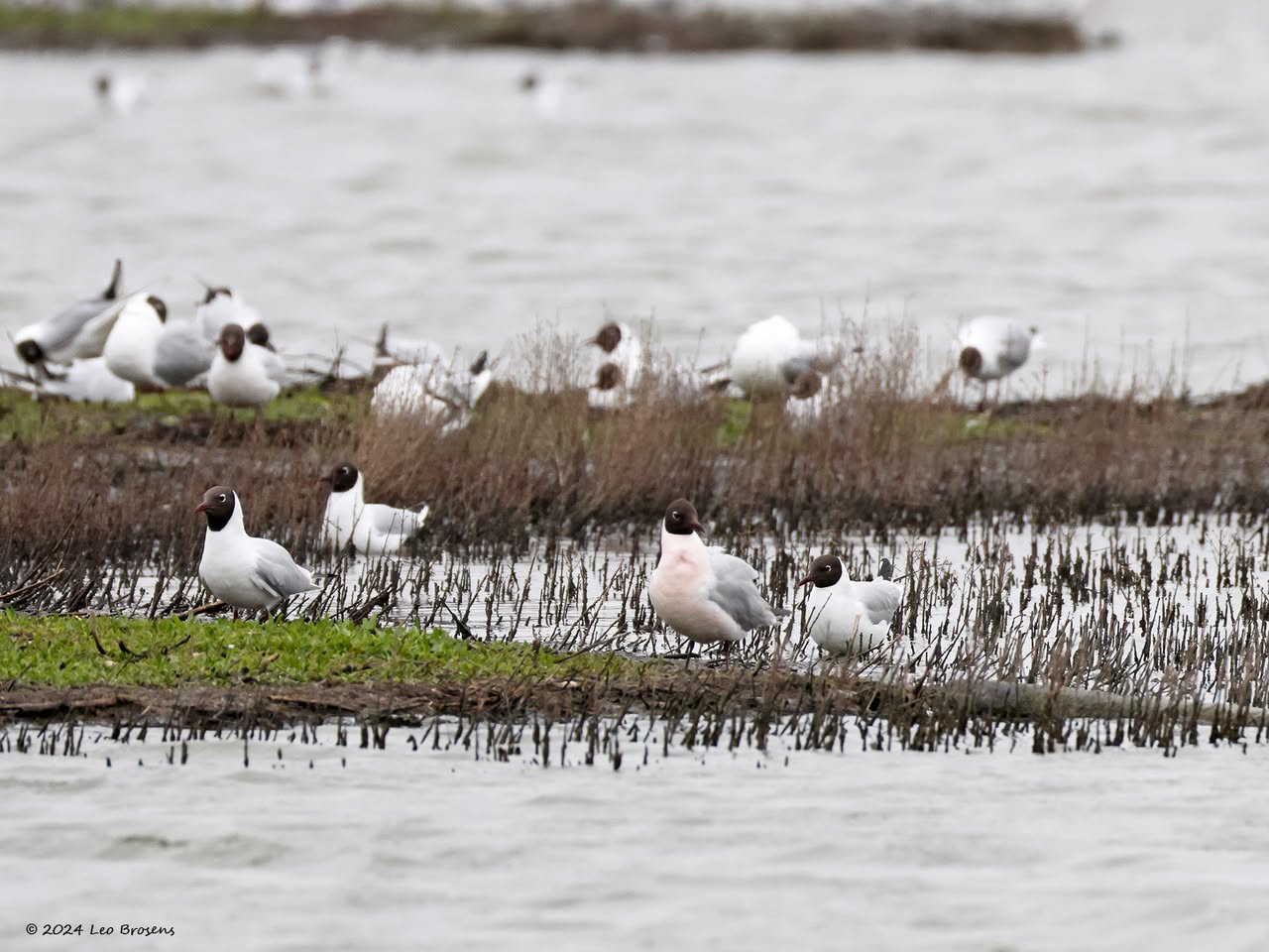 Een wonder! Een stormmeeuw die op water kan staan. Maar nee, zo'n vaart loopt het hier niet. In de leemskuilen was gisteren het laagje ijs al ver weggesmolten, vandaar een laagje water op het ijs. De stormmeeuw kun je nu hier af en toe aantreffen in weilanden. Hij is zichtbaar kleiner dan de zilvermeeuw, heeft geelgroene poten en heeft in winterkleed een donkere dwarsstreep op de snavelpunt. Die snavel is ook veel kleiner dan bij de zilvermeeuw.