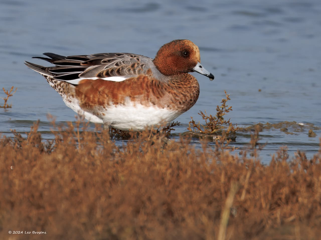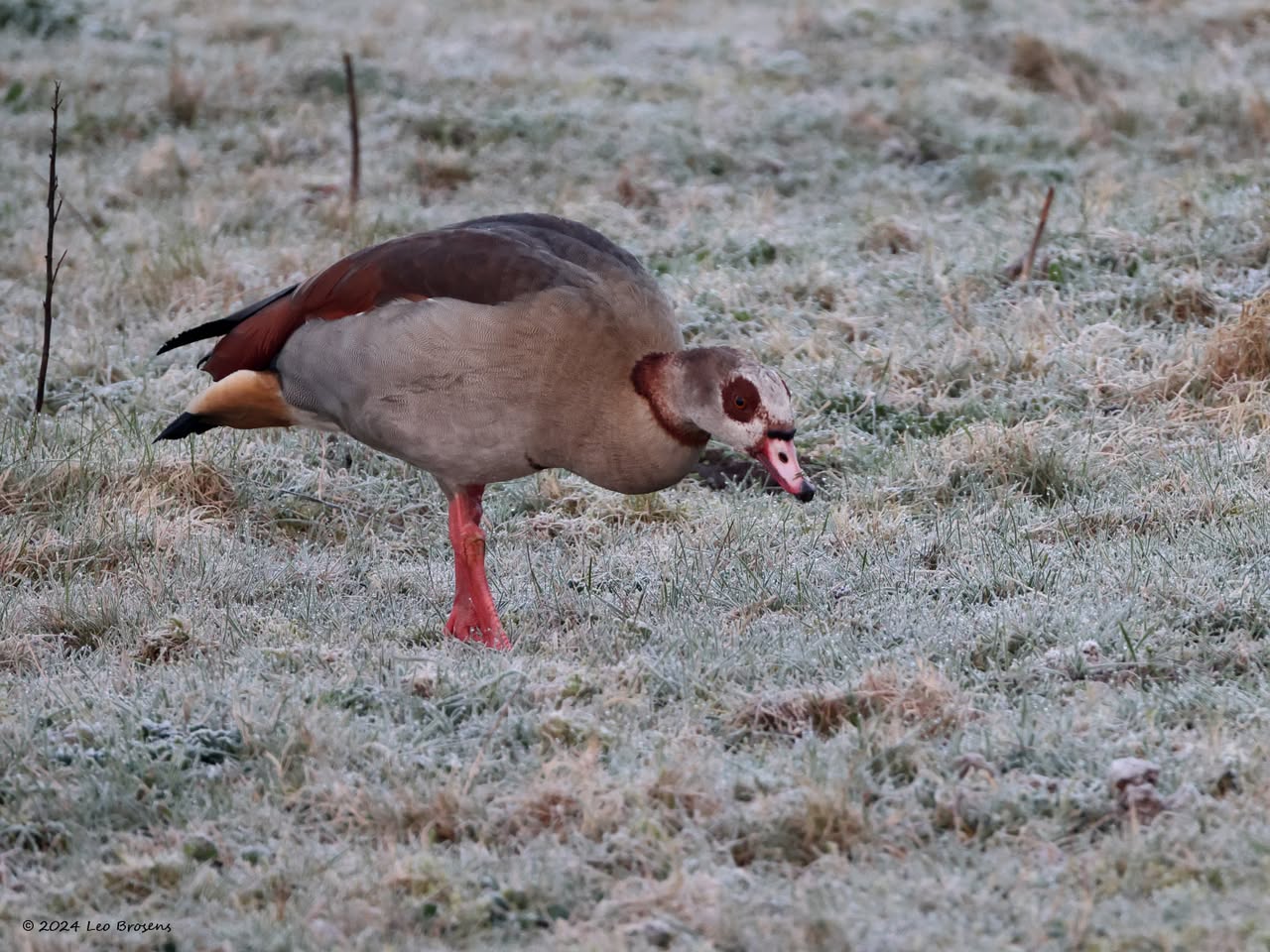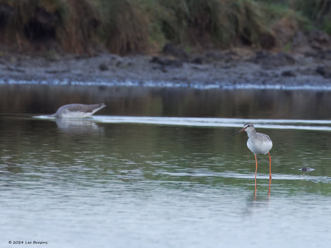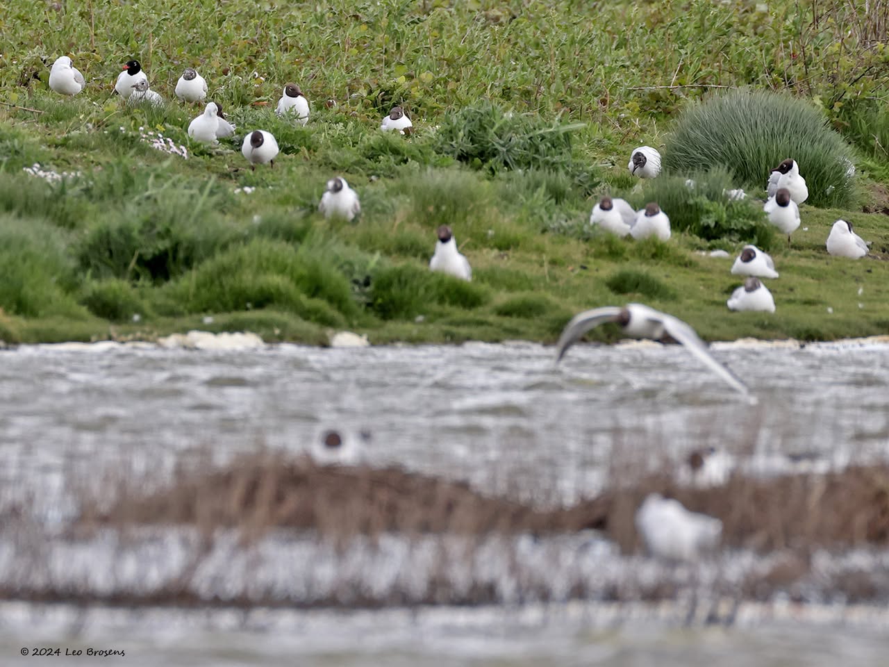 Een wonder! Een stormmeeuw die op water kan staan. Maar nee, zo'n vaart loopt het hier niet. In de leemskuilen was gisteren het laagje ijs al ver weggesmolten, vandaar een laagje water op het ijs. De stormmeeuw kun je nu hier af en toe aantreffen in weilanden. Hij is zichtbaar kleiner dan de zilvermeeuw, heeft geelgroene poten en heeft in winterkleed een donkere dwarsstreep op de snavelpunt. Die snavel is ook veel kleiner dan bij de zilvermeeuw.