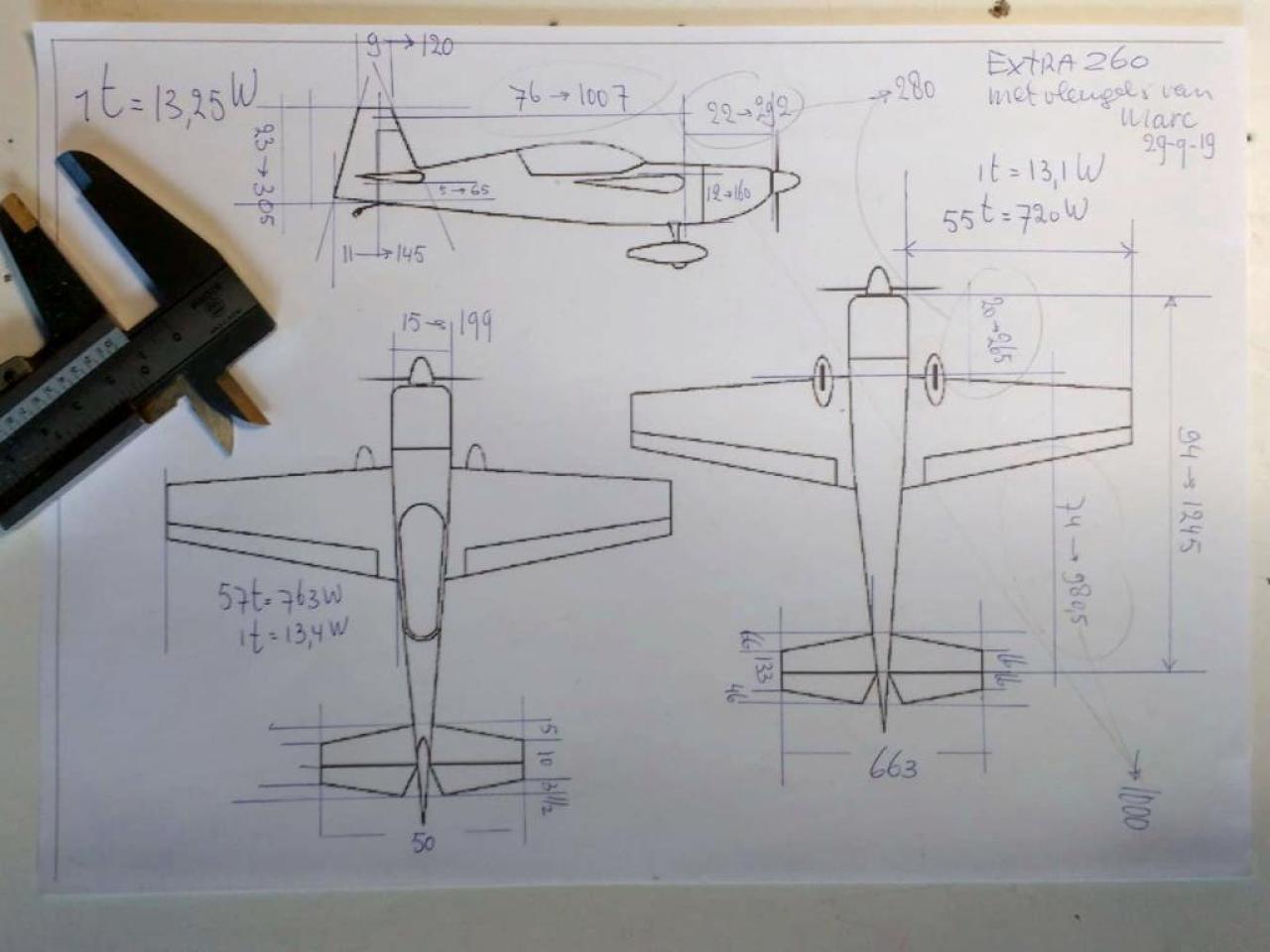 Op internet vond ik een eenvoudige afbeelding van iets dat voor een Extra 260 kon door gaan. Vanaf dat A4'tje met schuifmaat de maten ingeschat waarbij de werkelijke vleugel als referentie gold.