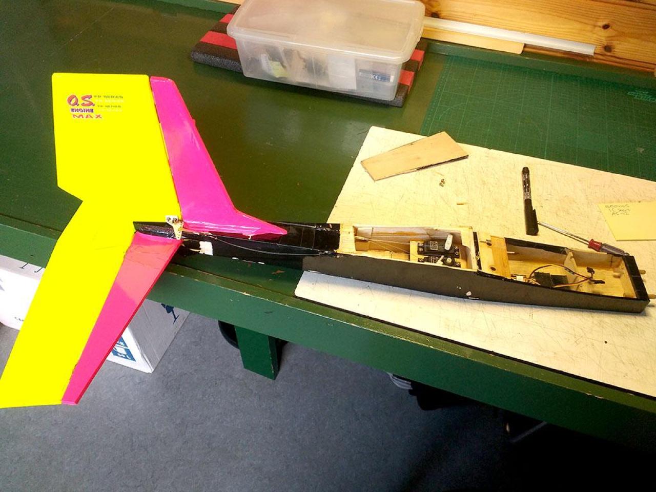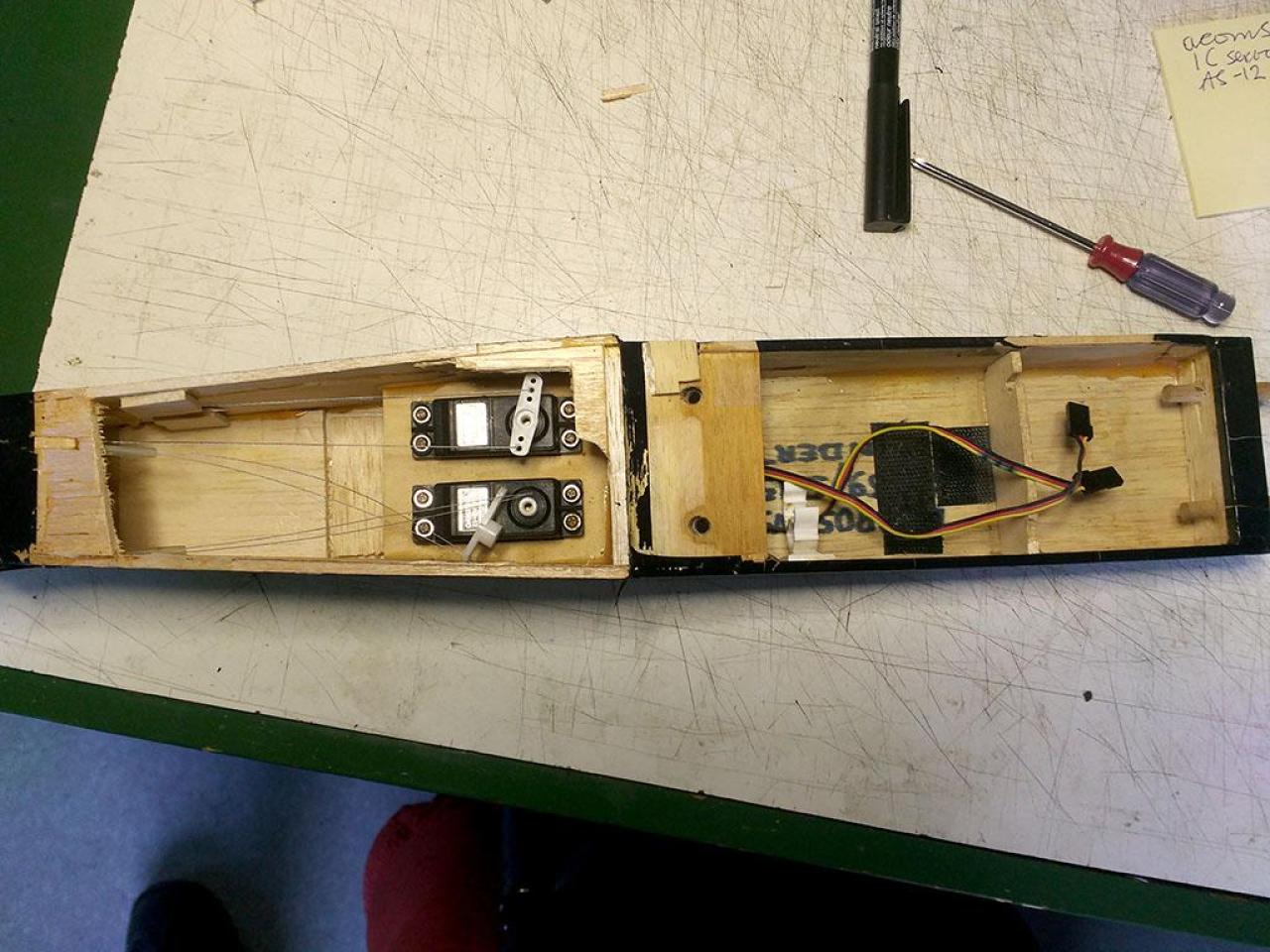 Met foamboard heb ik een batterijcompartiment gemaakt. De batterij moest eigenlijk iets meer naar achteren worden gemonteerd maar dat was niet mogelijk. De motor is om die reden wel zo dicht mogelijk tegen het houten bakje gemonteerd.