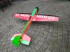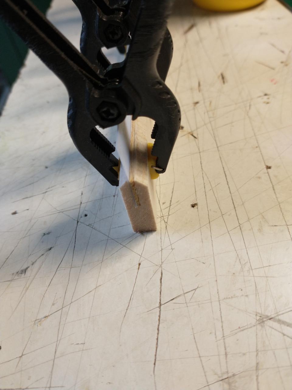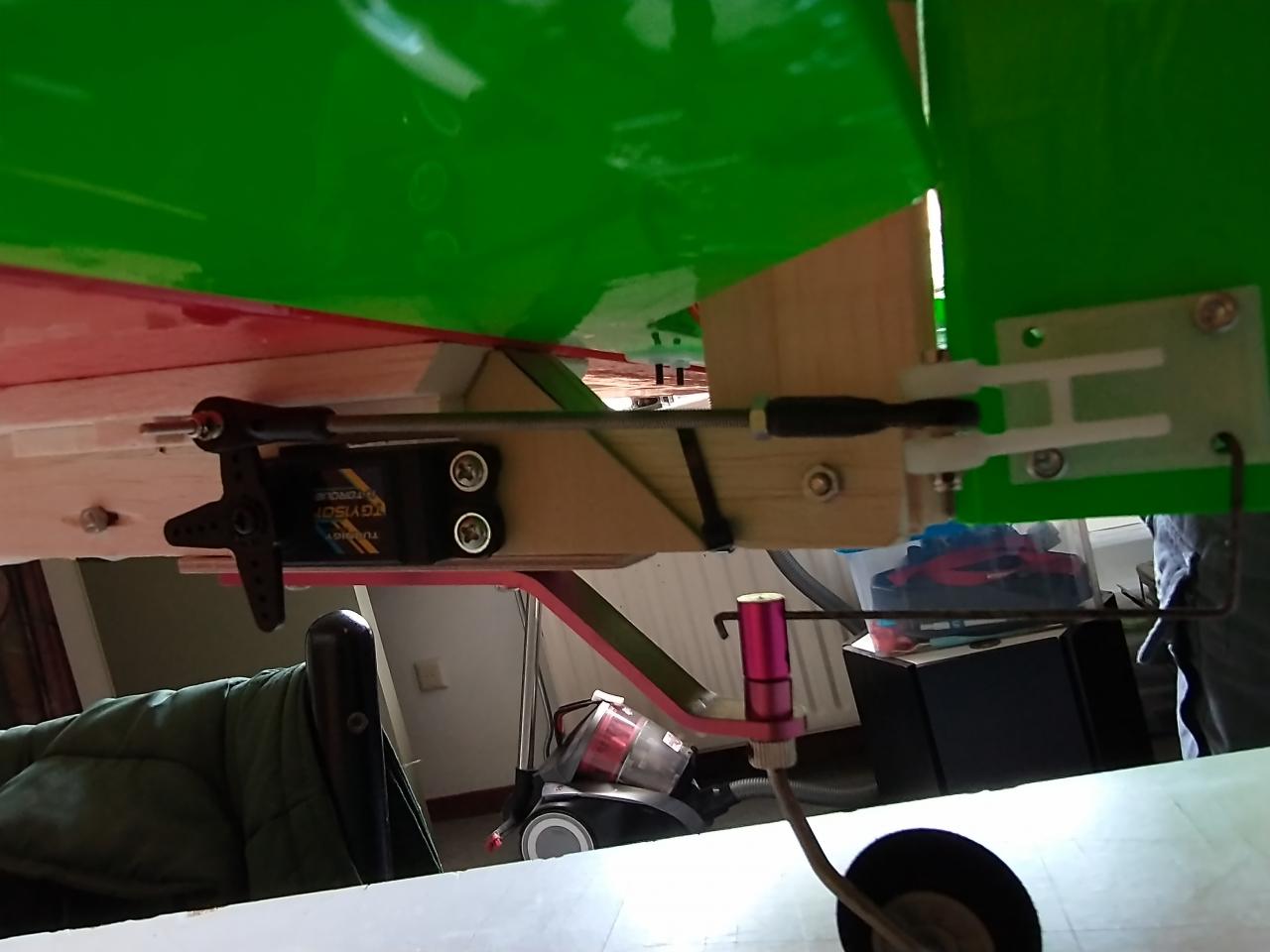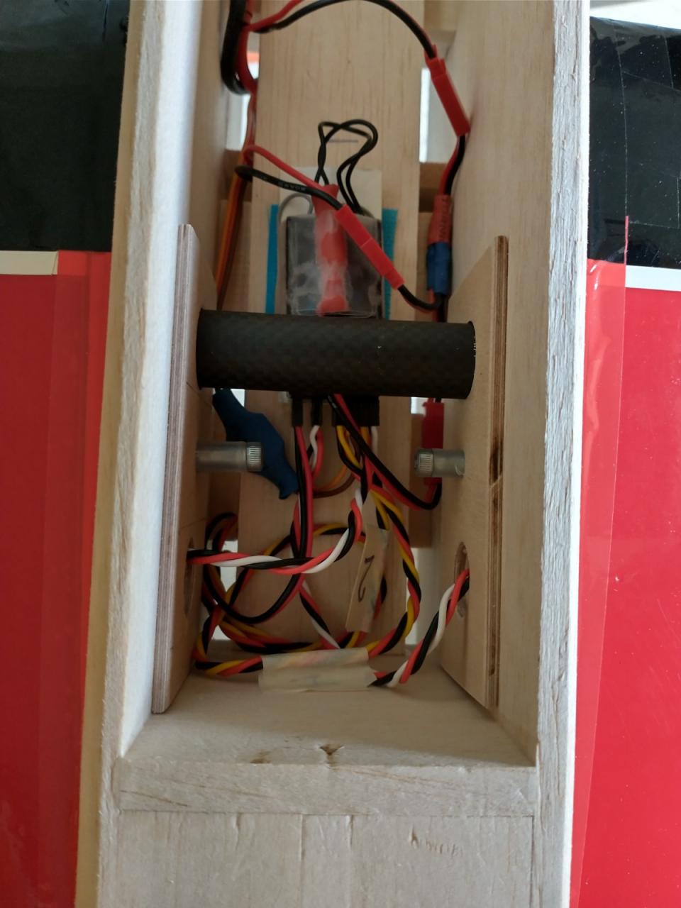 Ook aangepast is de montage van het landingsgestel. Daar toch een stukje 3 mm triplex onder de romp gelijmd en het carbon onderstel weer met 4 6mm nylon bouten vast gezet.