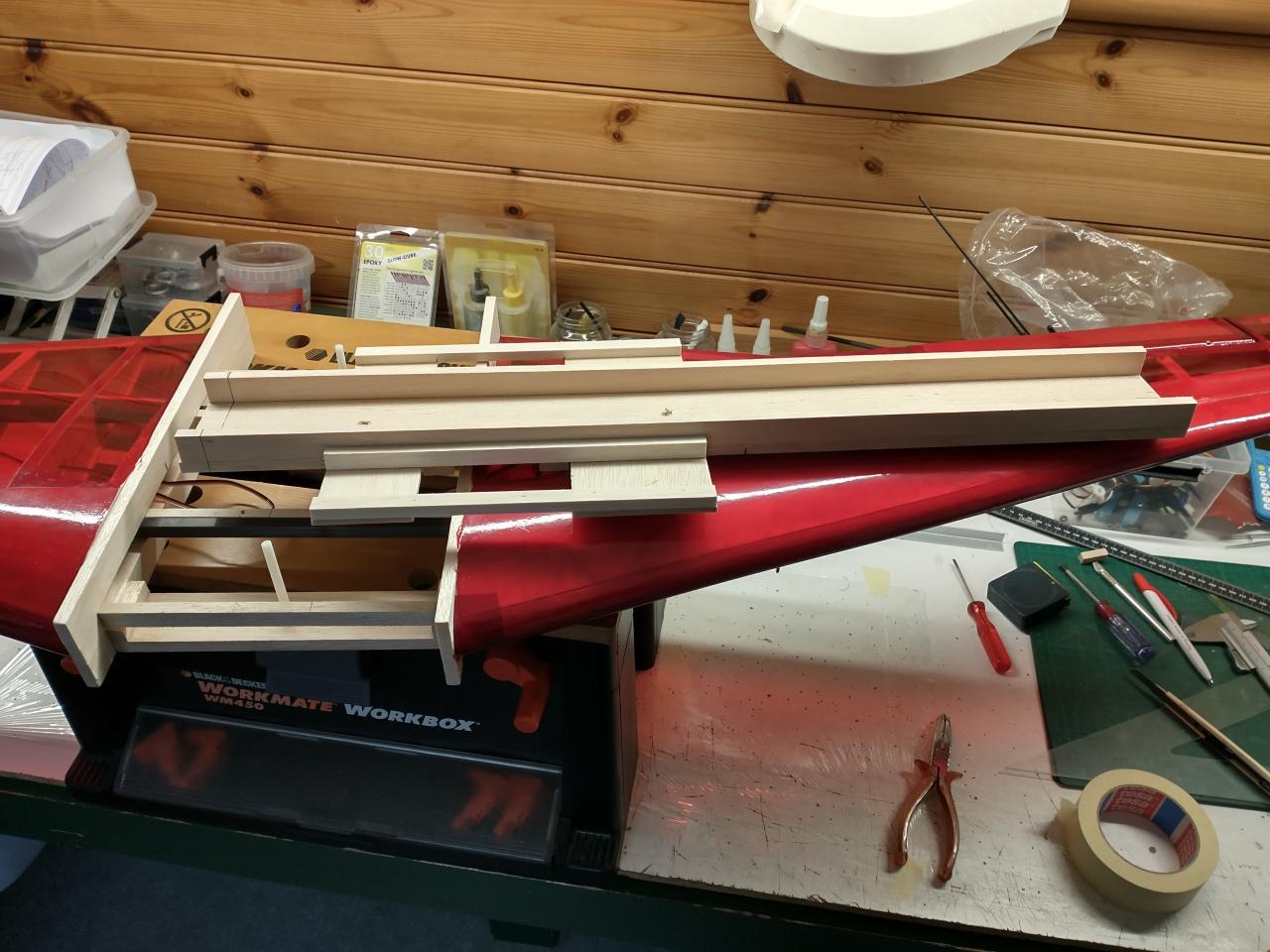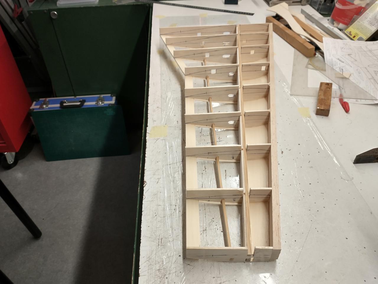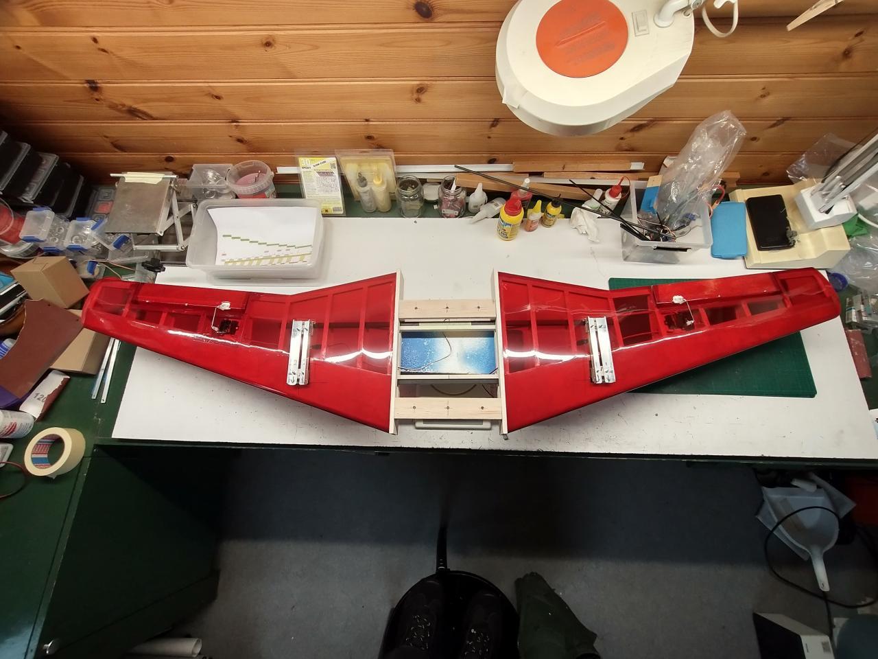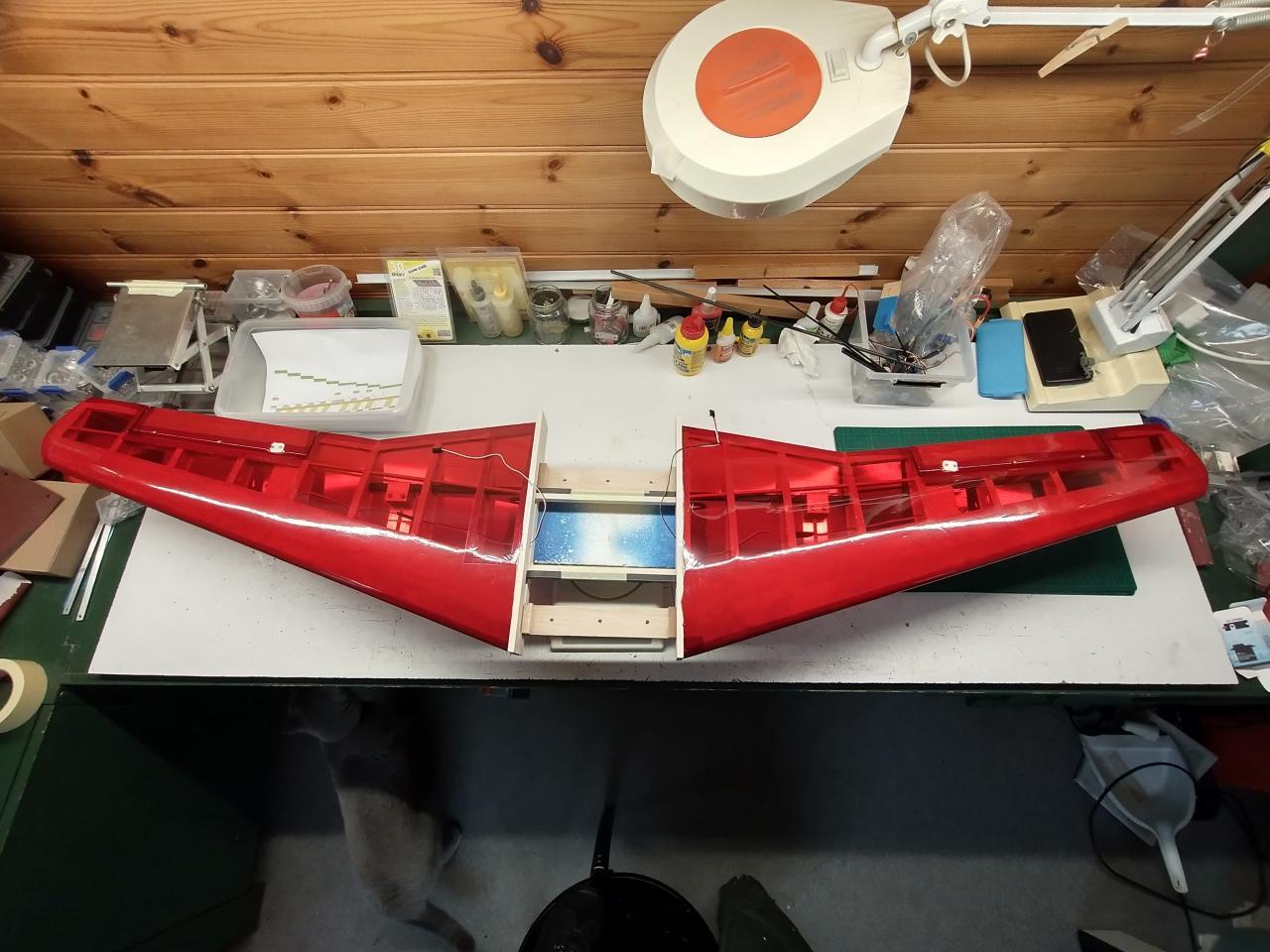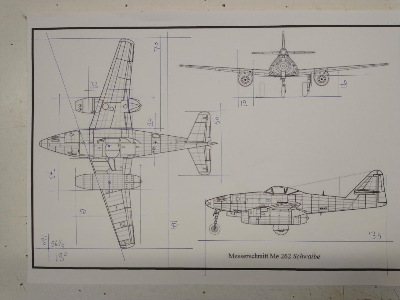 Messerschmitt ME 262 / Specificaties Afmetingn:Spanwijdte = 165 cmBouw:Vleugelvoorinstelling = 4 mm over 148 mm ofwel 1,7 gradenVleugelveestelling = 10 over 148 mm ofwel 2 x 2 graden Gewicht:Vleugel bespannen met servo's en ophangsysteem = 820 gram