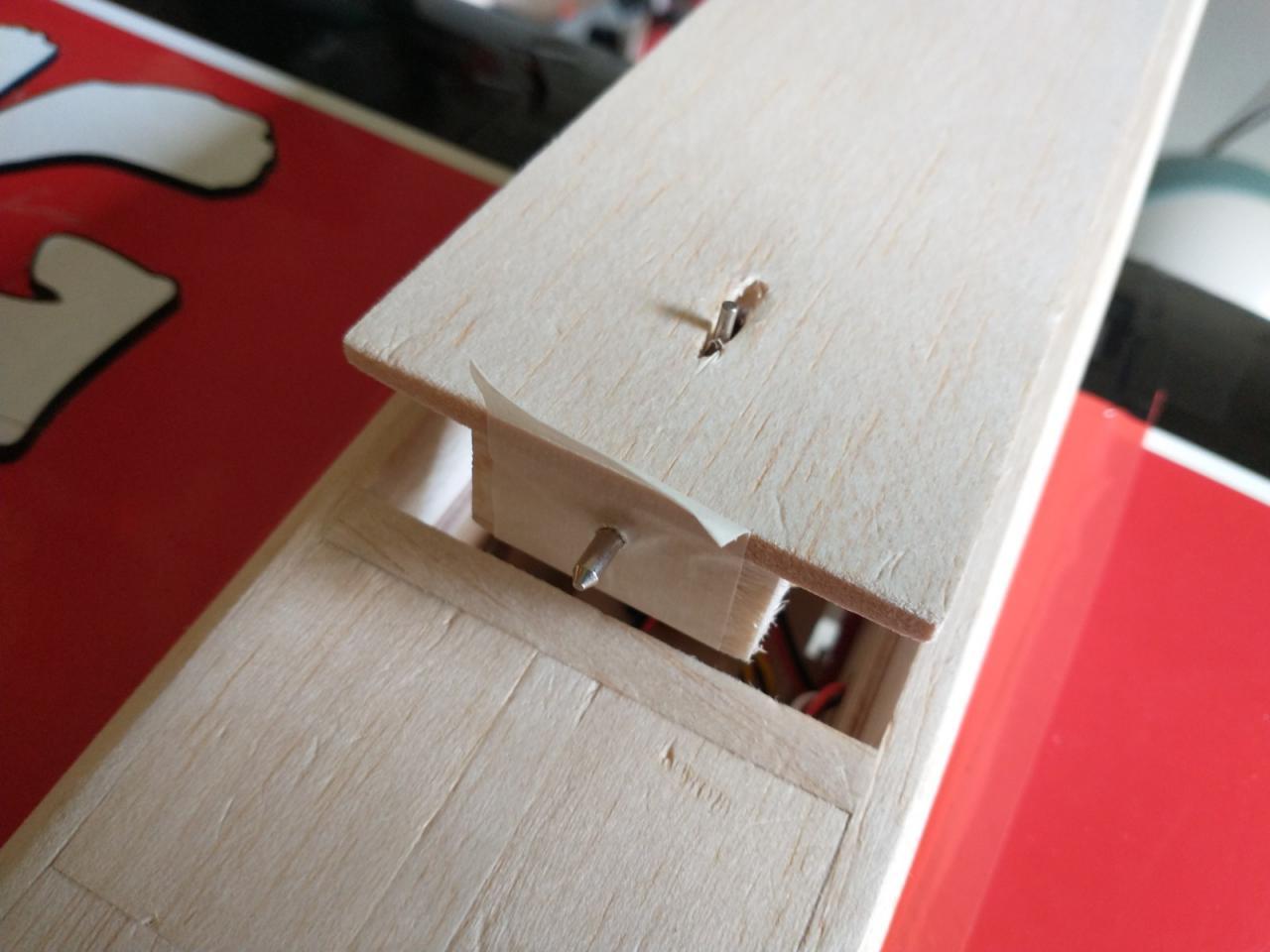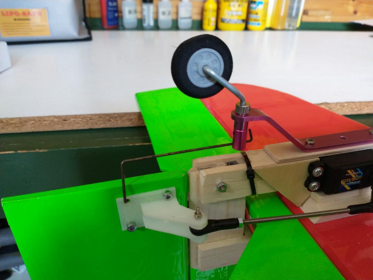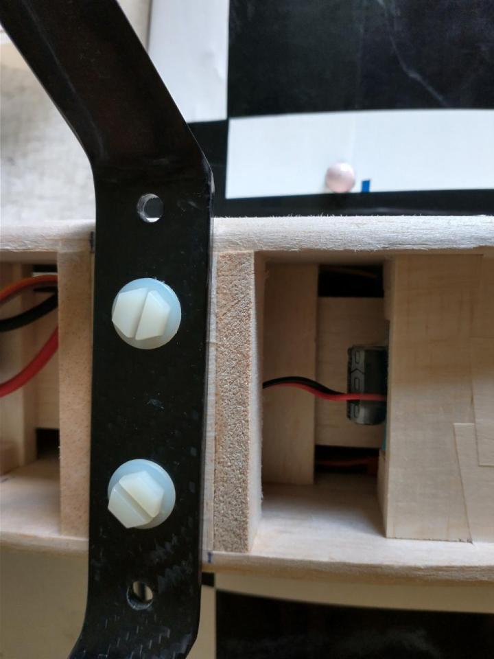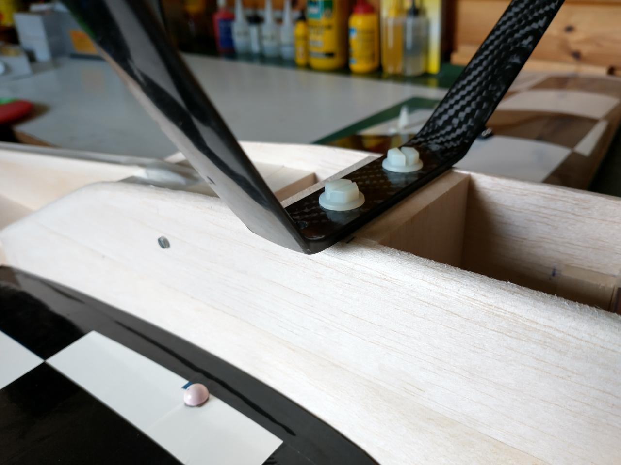 Ook aangepast is de montage van het landingsgestel. Daar toch een stukje 3 mm triplex onder de romp gelijmd en het carbon onderstel weer met 4 6mm nylon bouten vast gezet.