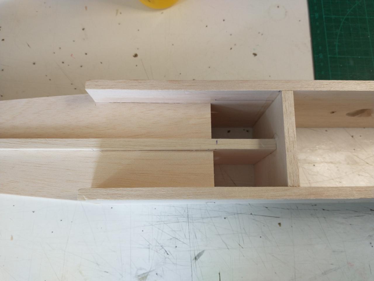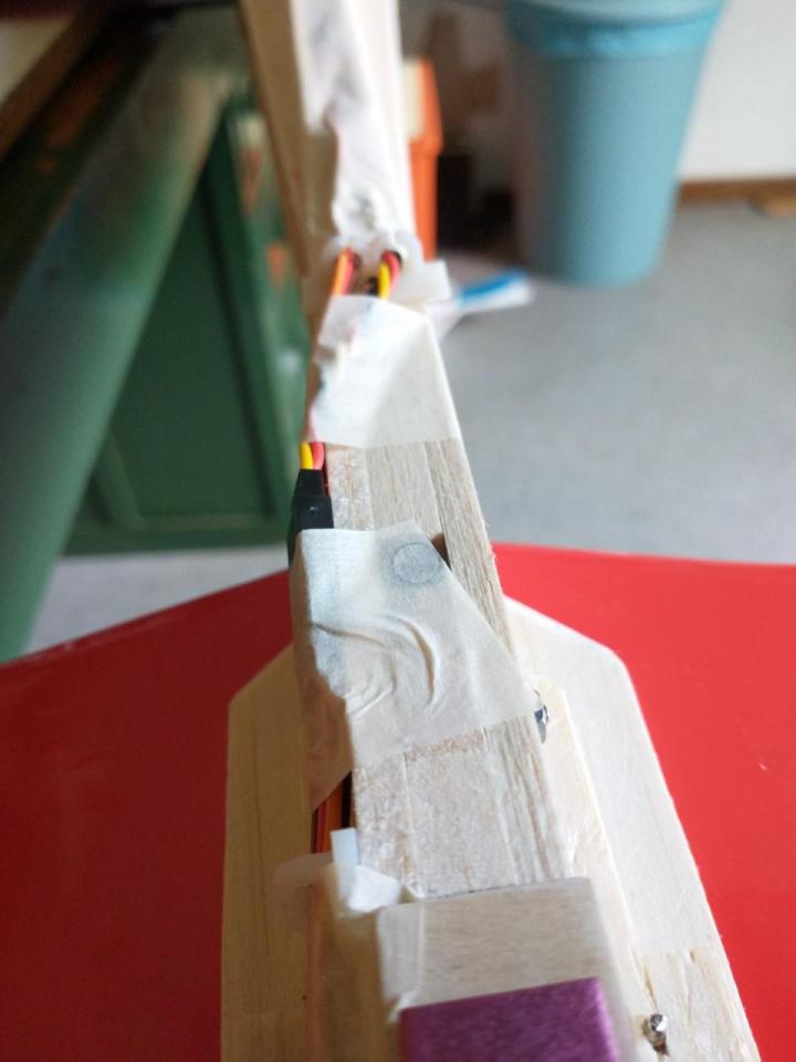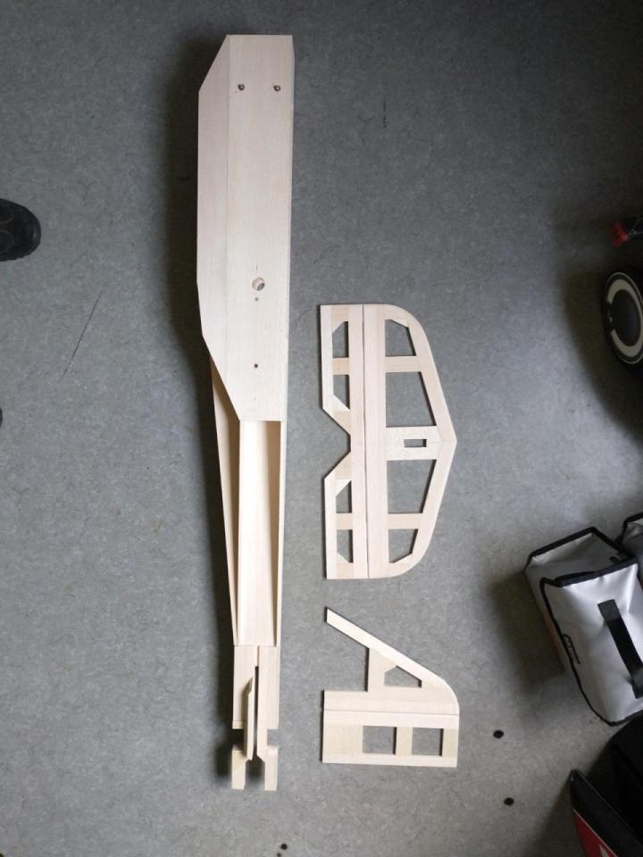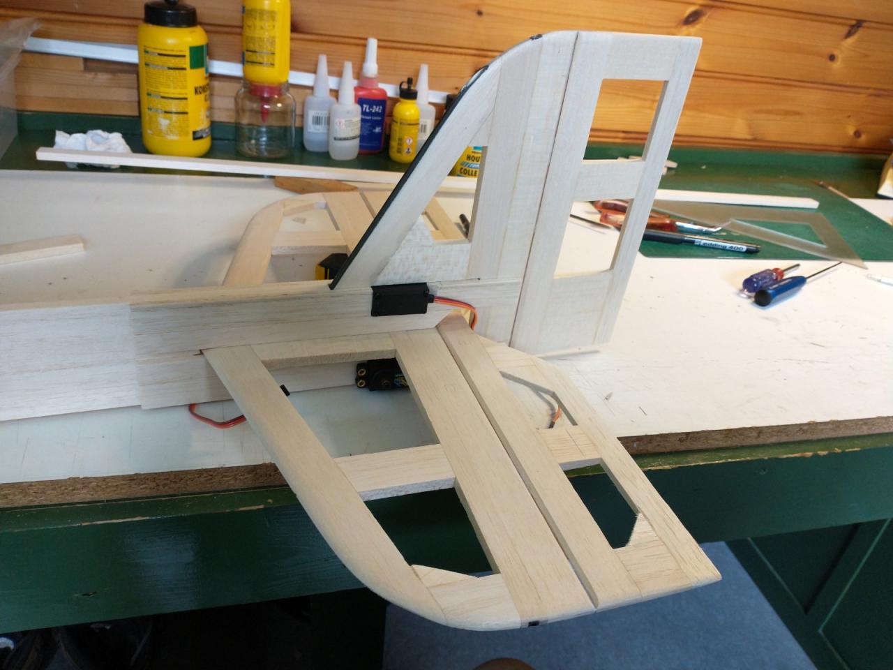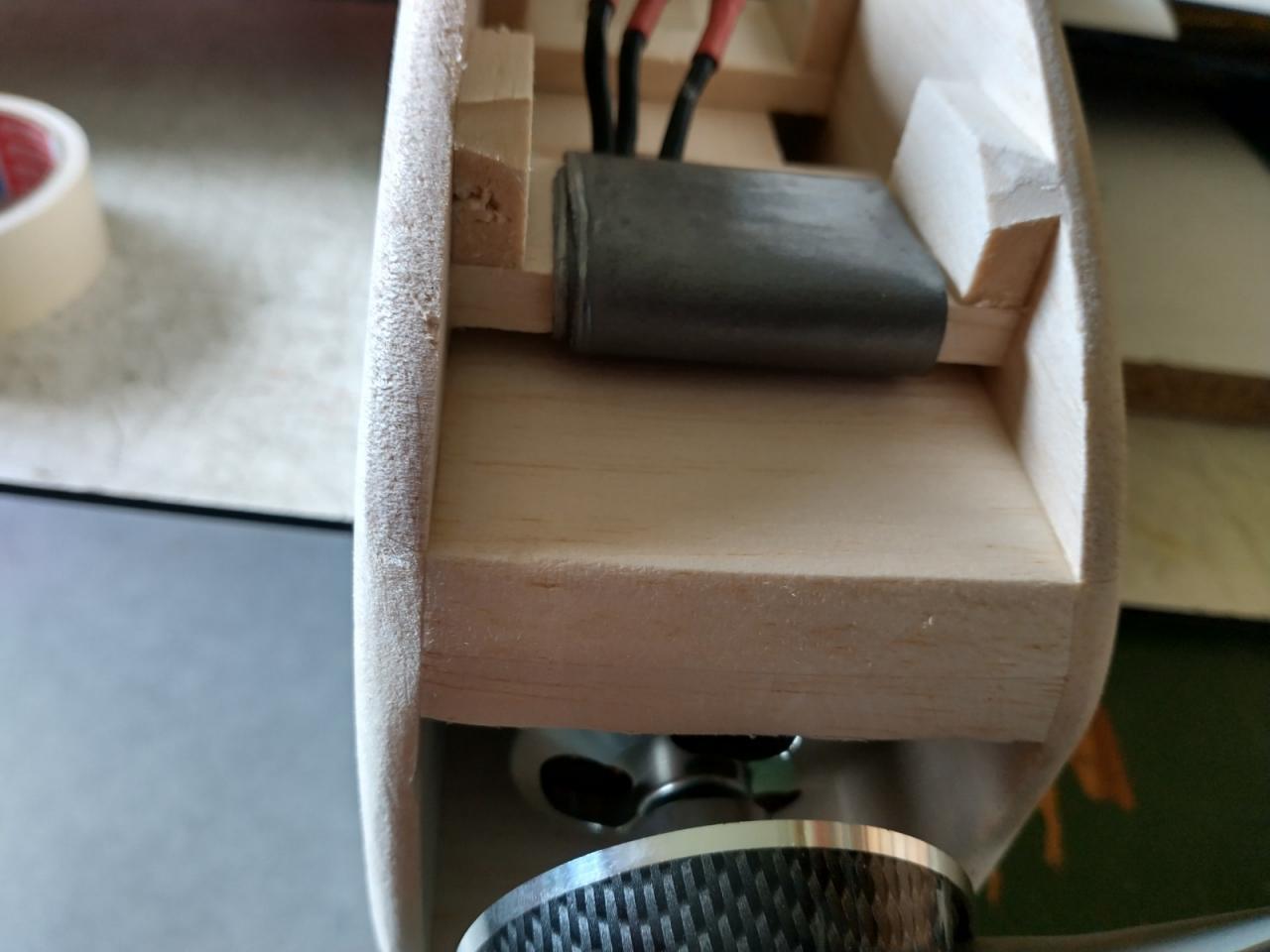 Ook aangepast is de montage van het landingsgestel. Daar toch een stukje 3 mm triplex onder de romp gelijmd en het carbon onderstel weer met 4 6mm nylon bouten vast gezet.