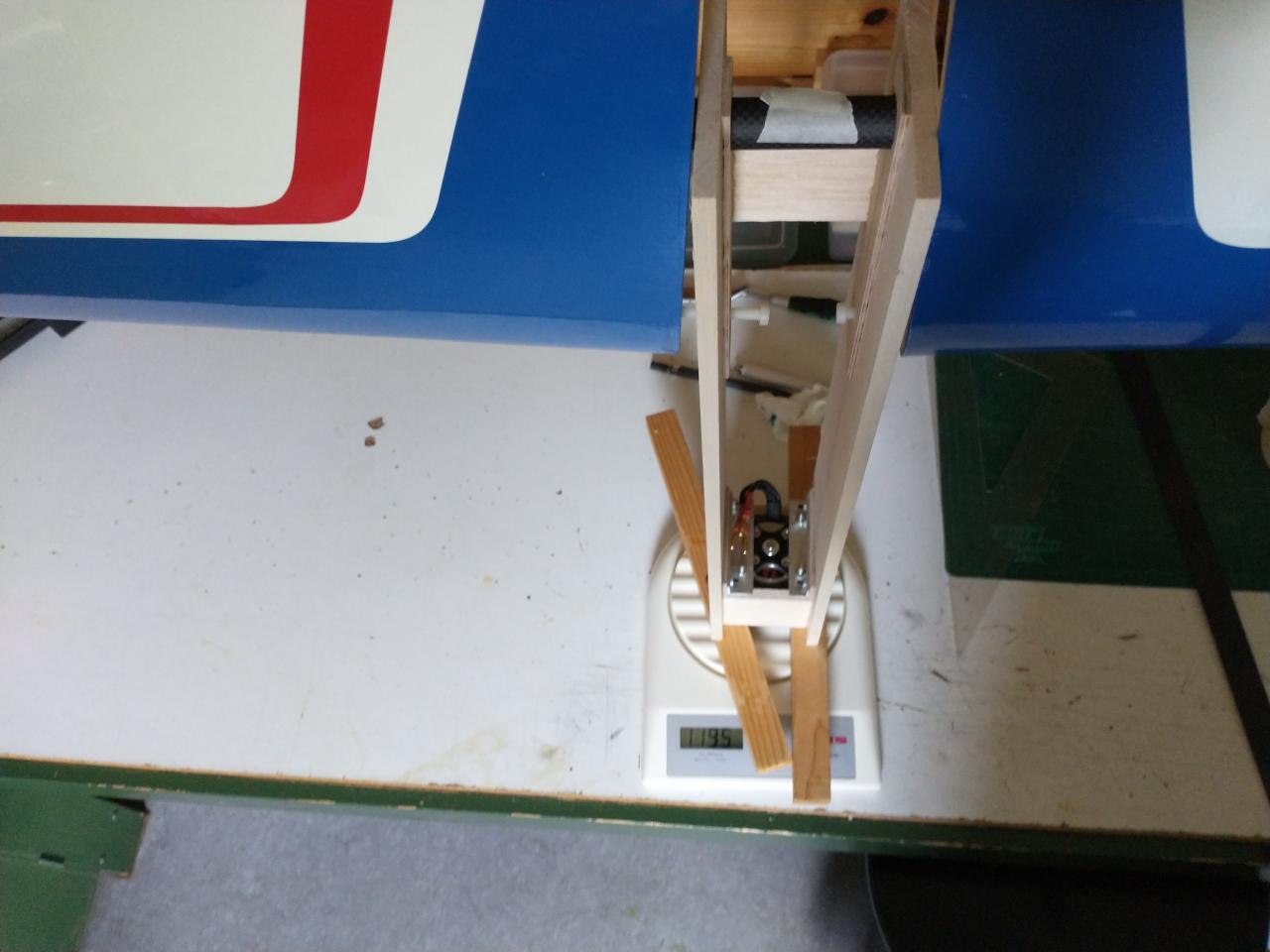 Met 6S 5000 mAh onbeplakt ongeschilderd = 3800 gram Let op! Later nog 200 gram lood in de neus gedaan om het CG te verbeteren. Totaalgewicht incl. lood = 4100 gram.