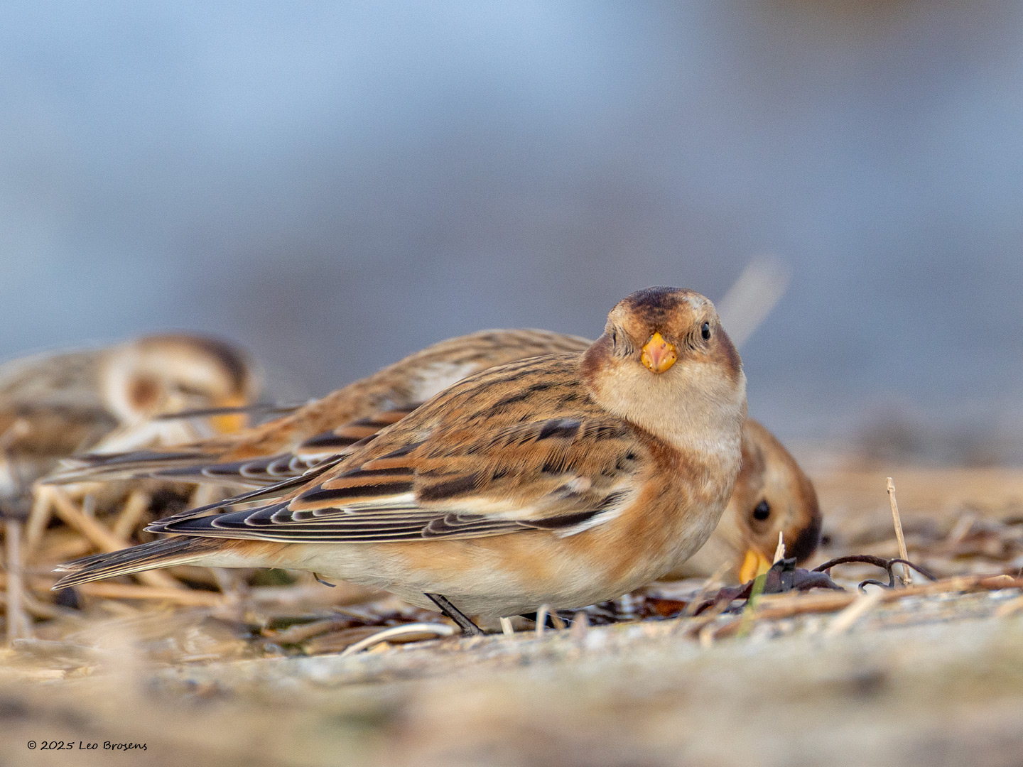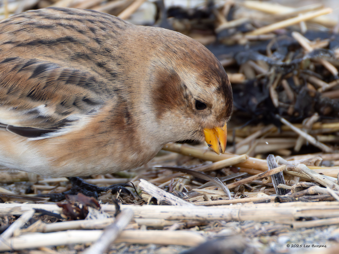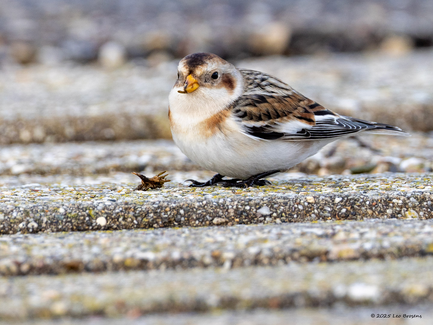 Sneeuwgors  20260110  Gisteren zijn er nog gezien op de Oesterdam. Deze zag ik daar wat eerder. Zonder sneeuw zijn ze al makkelijk over het hoofd te zien vanwege hun schutkleuren, dat zal met sneeuw erbij niet beter zijn denk ik. Het mannetje is veel witter gekleed dan het vrouwtje. Echte kustvogeltjes zijn het.