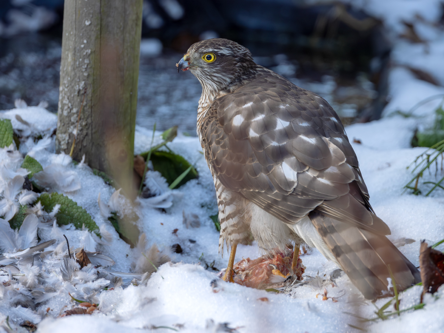 Sperwer  20260104  In mijn tuin begon het nieuwe jaar bloederig. Vanmorgen heeft opnieuw een sperwer, ik denk een jong vrouwtje deze keer, een tortel gepakt. Het gebeurde bij de plaats waar ik ook wel voer. Is dat de kat op het spek binden? Overduidelijk is dat mijn tuin in het jachtgebied van sperwers ligt. Ik hoop echt dat ik nog enkele tortels over houd en dat er een succesvol broedseizoen voor hen volgt.