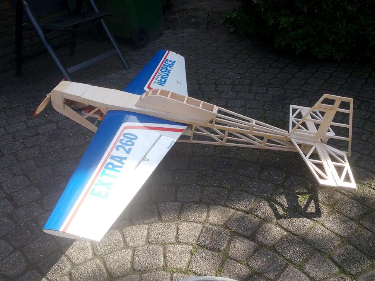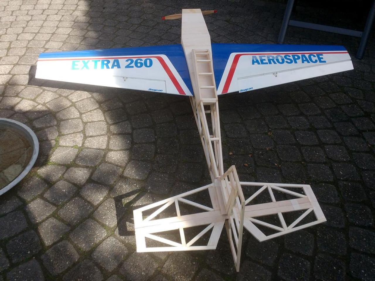 Marc Marien vroeg me herhaaldelijk om voor vleugels die hij nog had liggen een romp te maken, van een Extra 260, spanwijdte 160 cm.