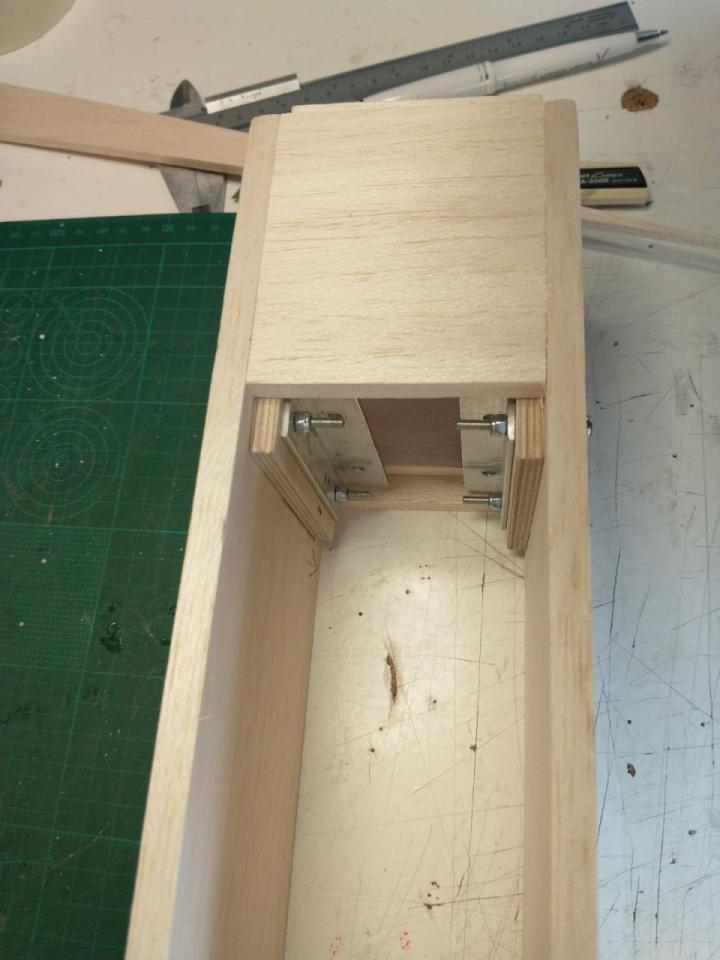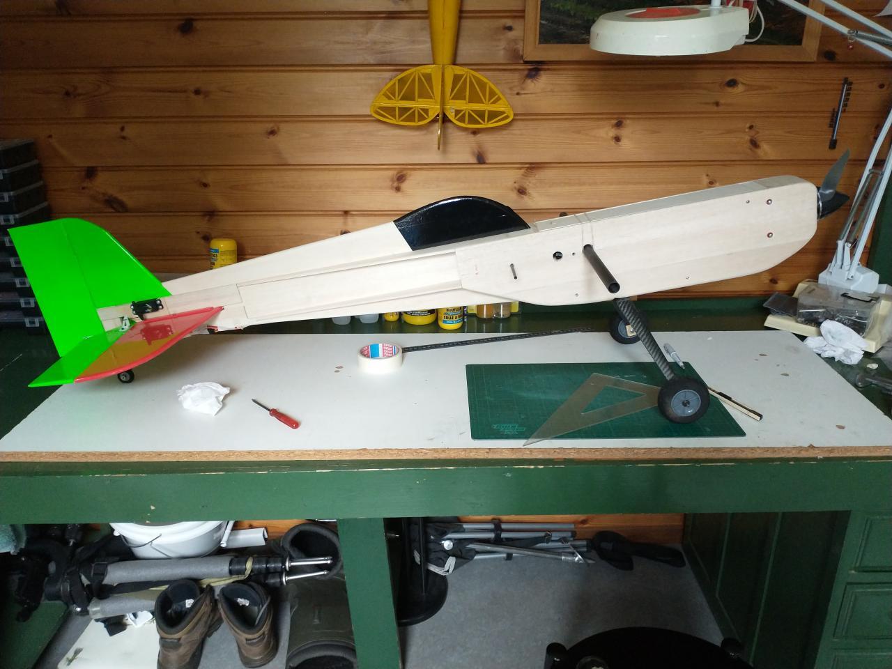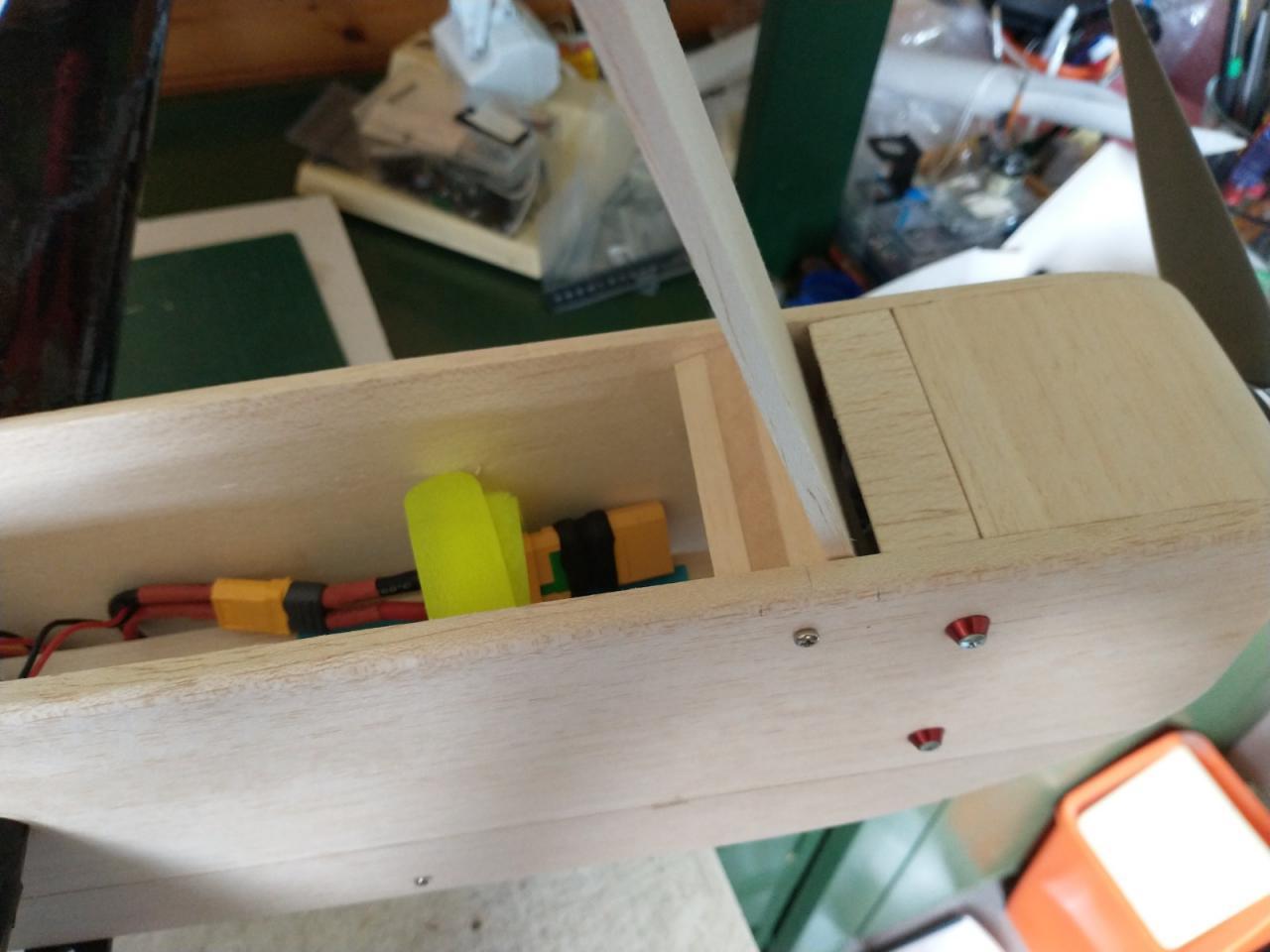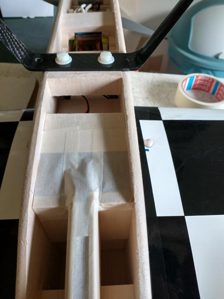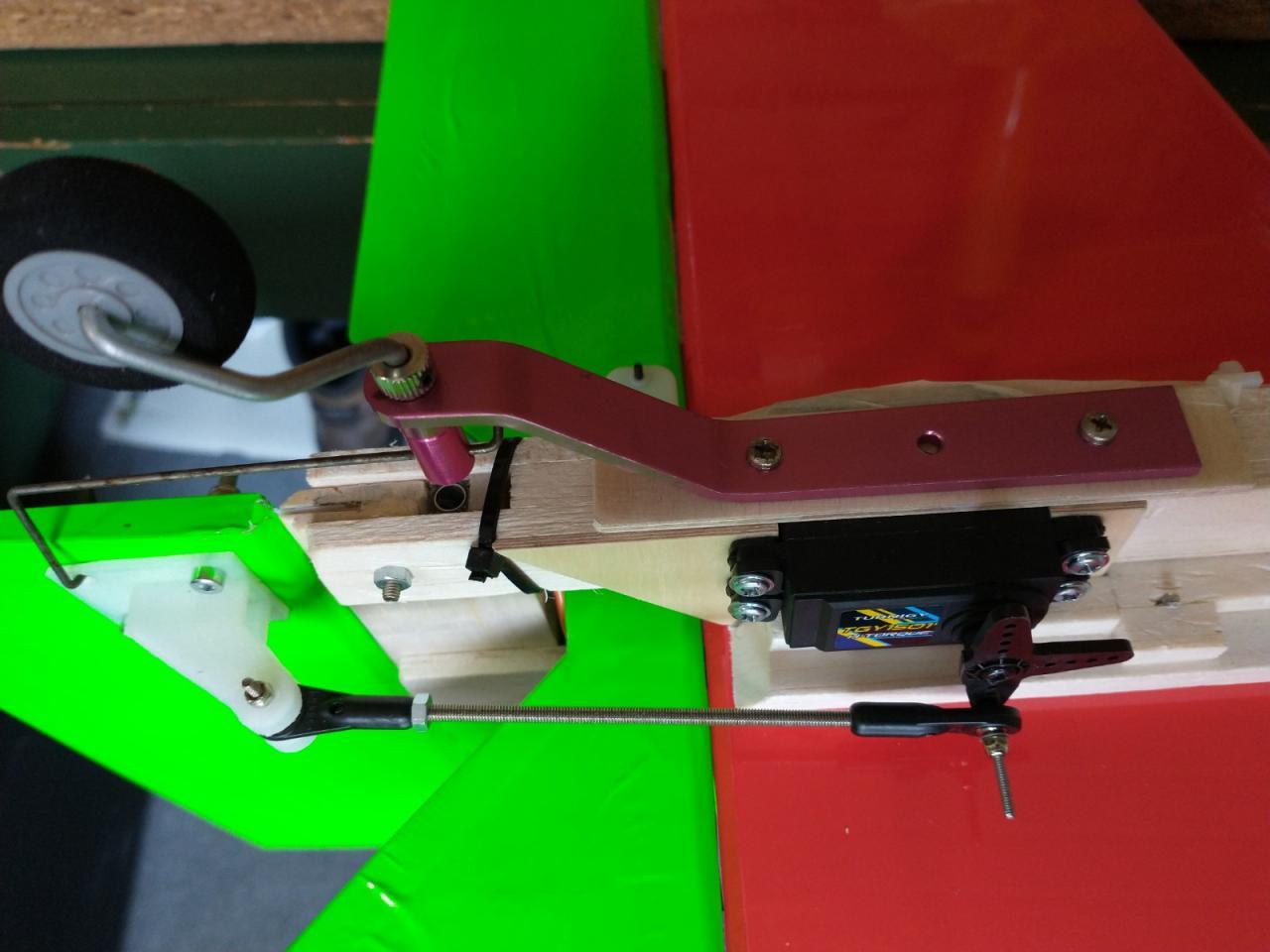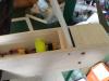 Ook aangepast is de montage van het landingsgestel. Daar toch een stukje 3 mm triplex onder de romp gelijmd en het carbon onderstel weer met 4 6mm nylon bouten vast gezet.
