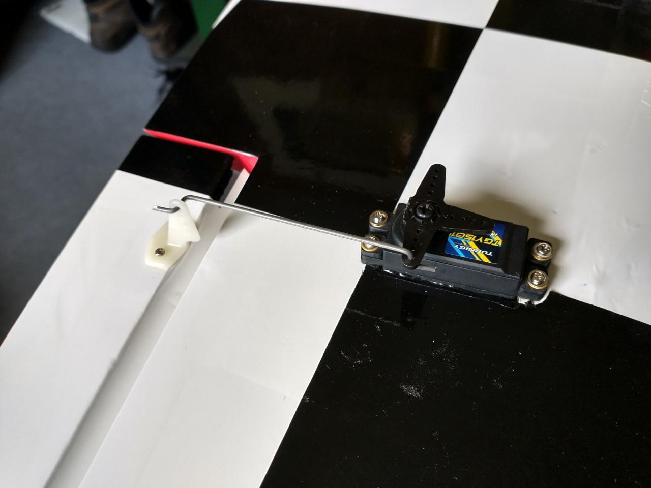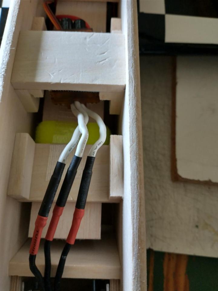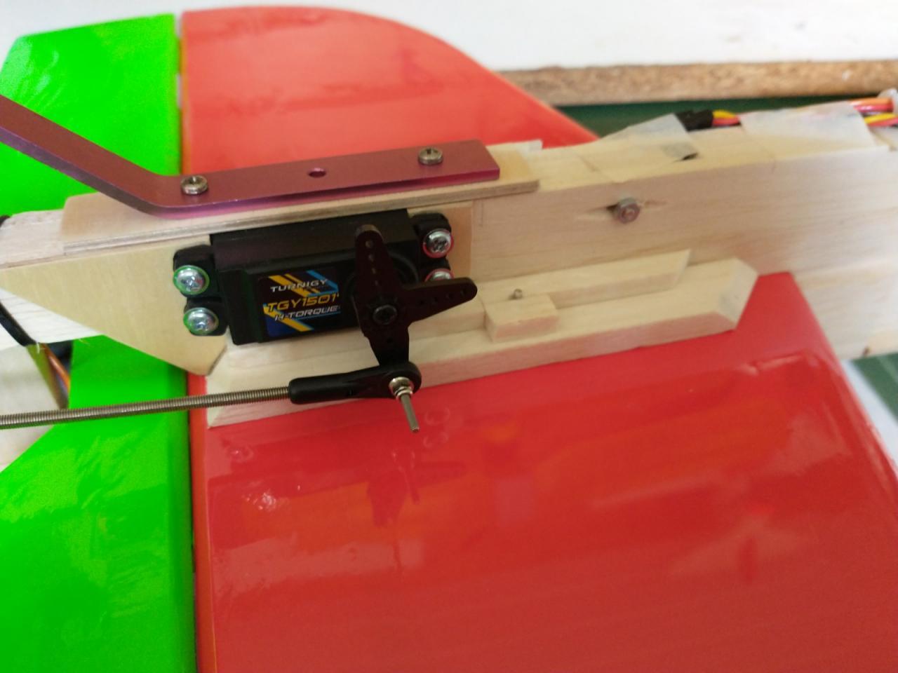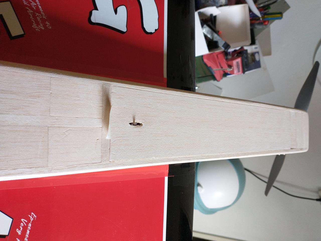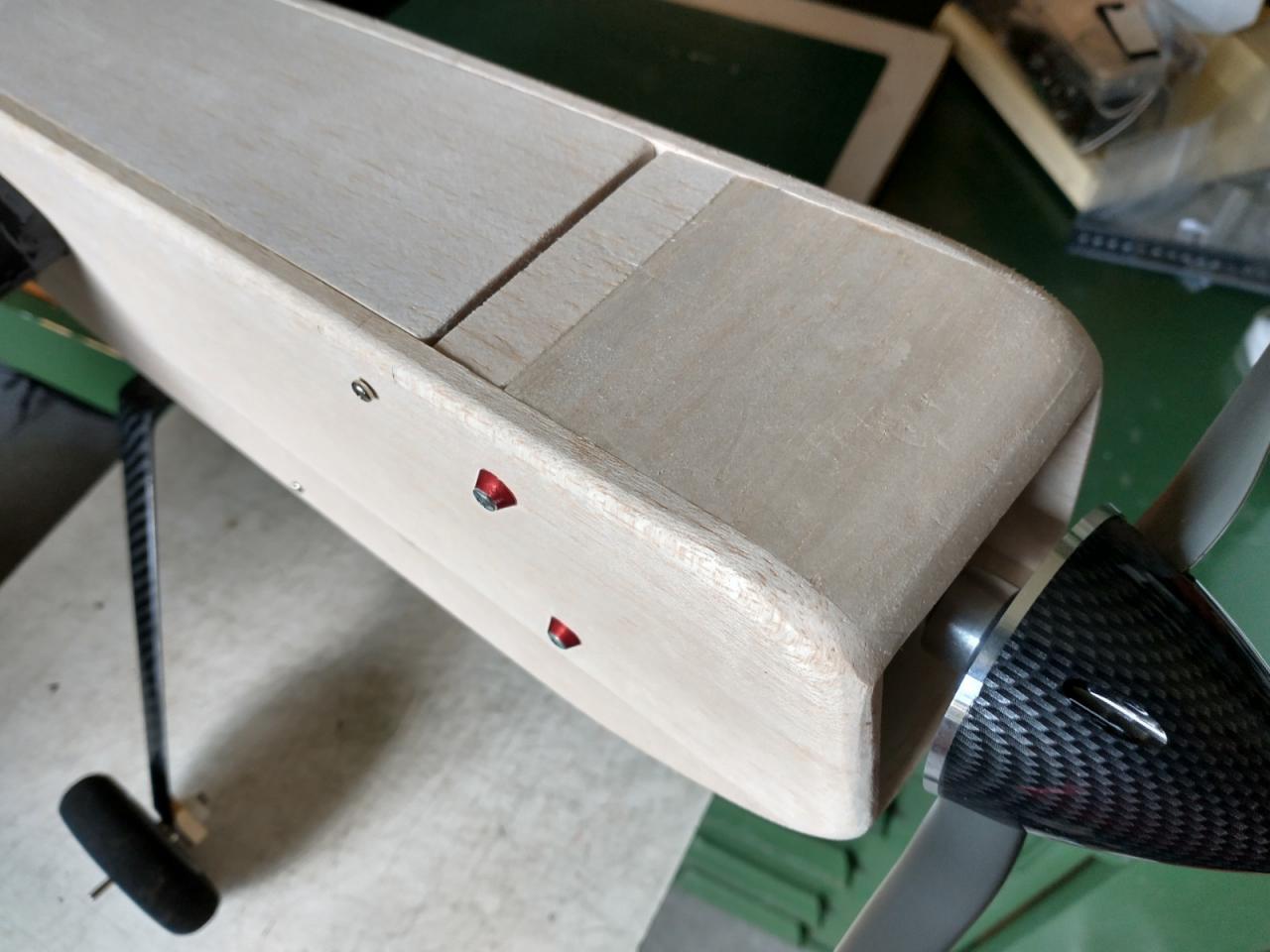 Ook aangepast is de montage van het landingsgestel. Daar toch een stukje 3 mm triplex onder de romp gelijmd en het carbon onderstel weer met 4 6mm nylon bouten vast gezet.