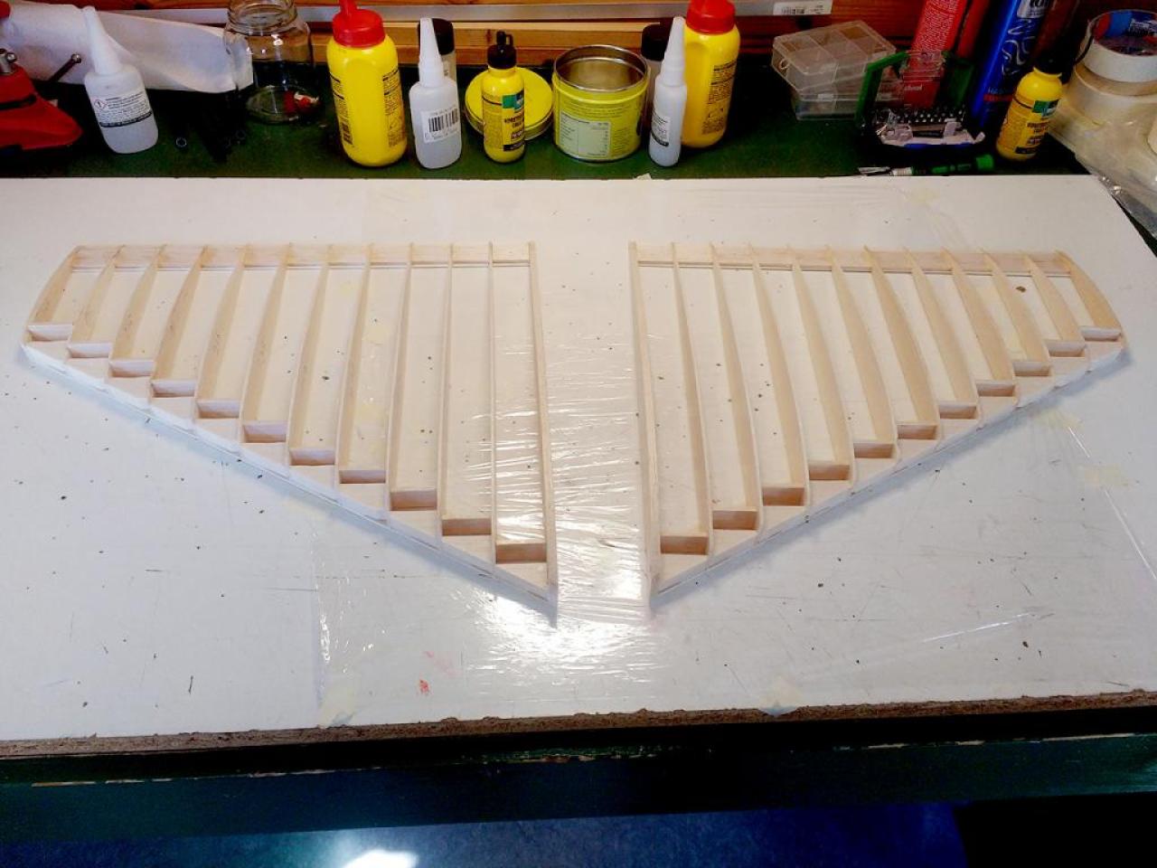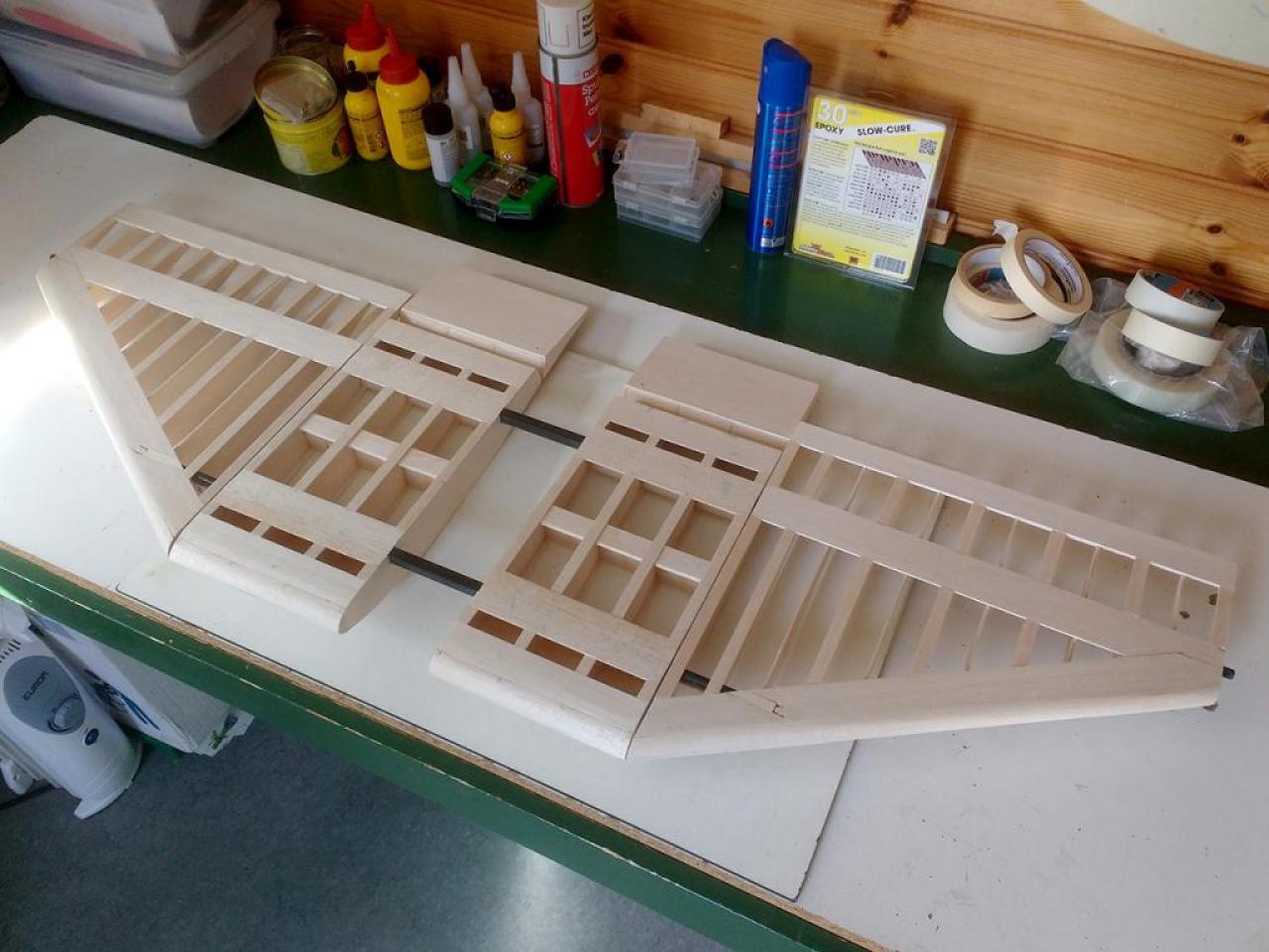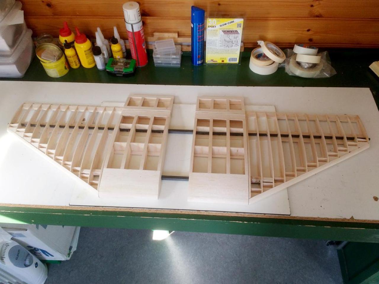 Op 29-1-2020 had ik een verdere aanpak gereed. Nu met hogere wielen en de staart opnieuw gemonteerd. Het CG via cgCalc ingeschat en ingeregeld op 20 cm achter LE bij romp. Zie foto: .