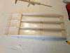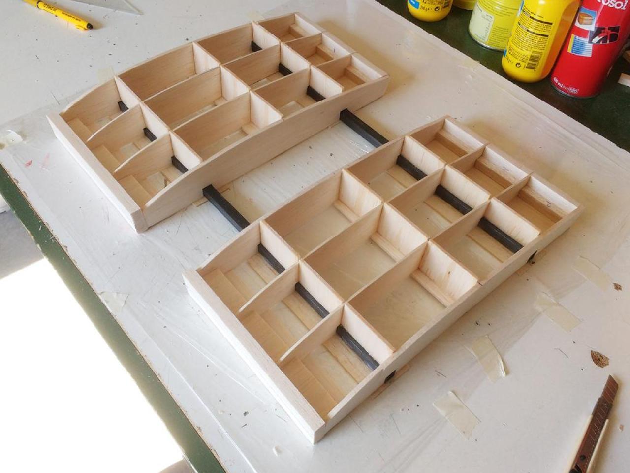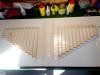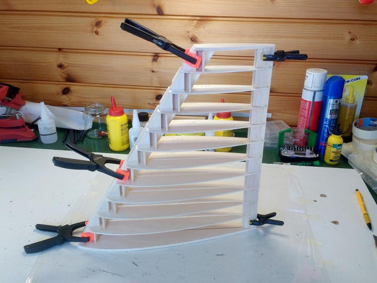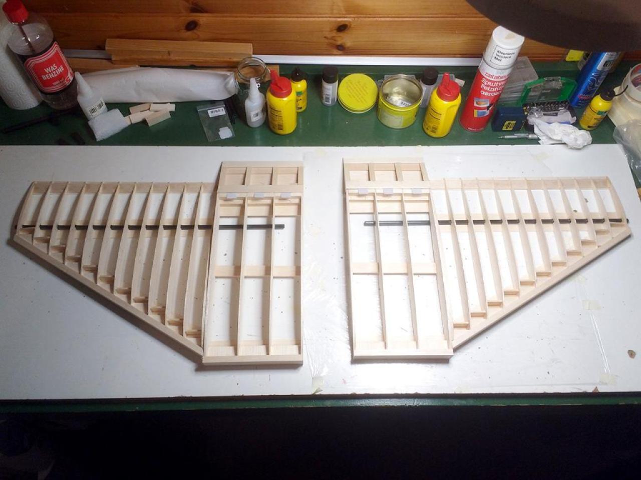 Op 29-1-2020 had ik een verdere aanpak gereed. Nu met hogere wielen en de staart opnieuw gemonteerd. Het CG via cgCalc ingeschat en ingeregeld op 20 cm achter LE bij romp. Zie foto: .